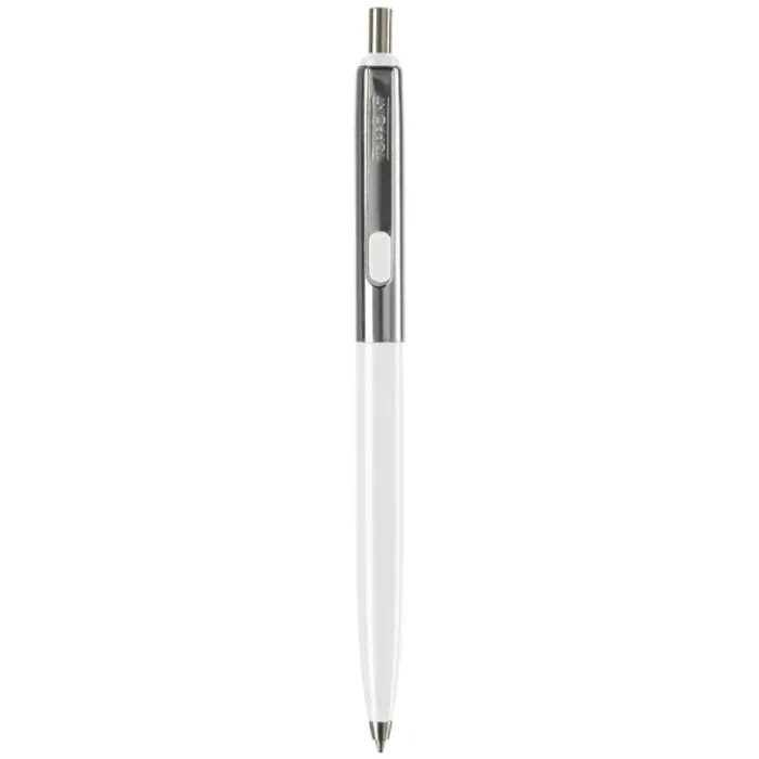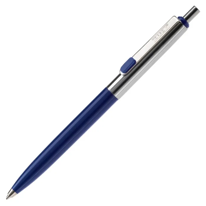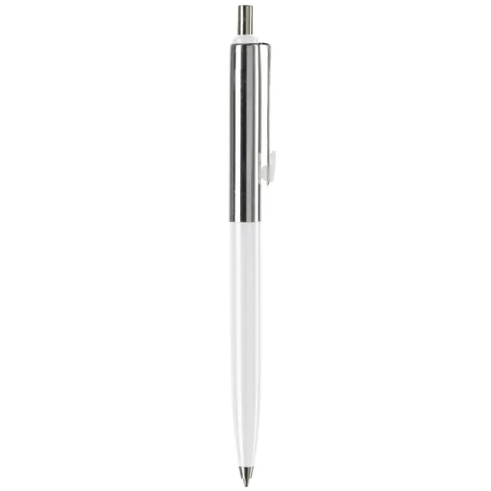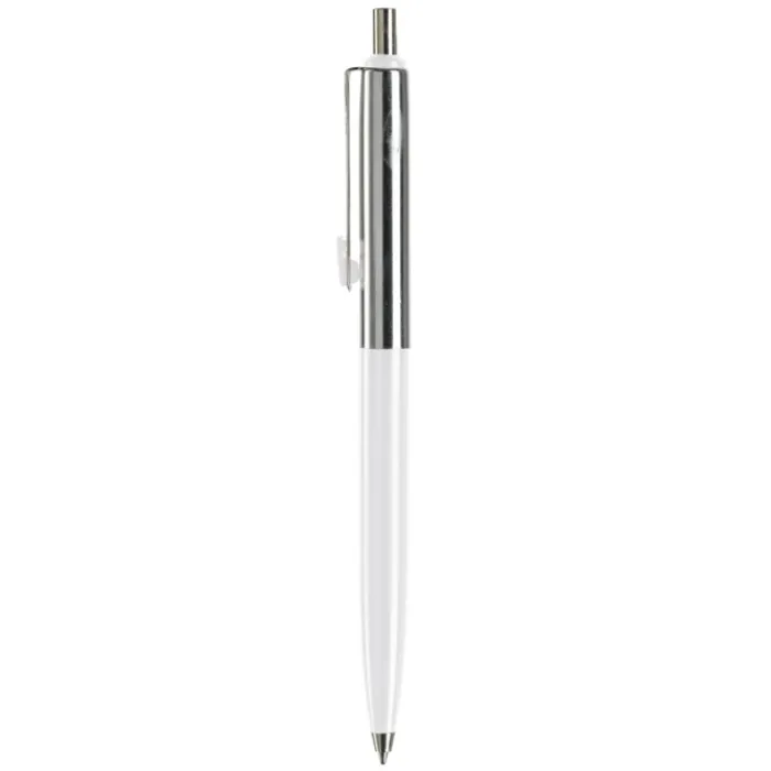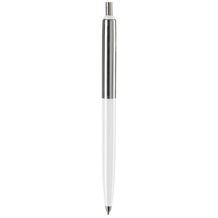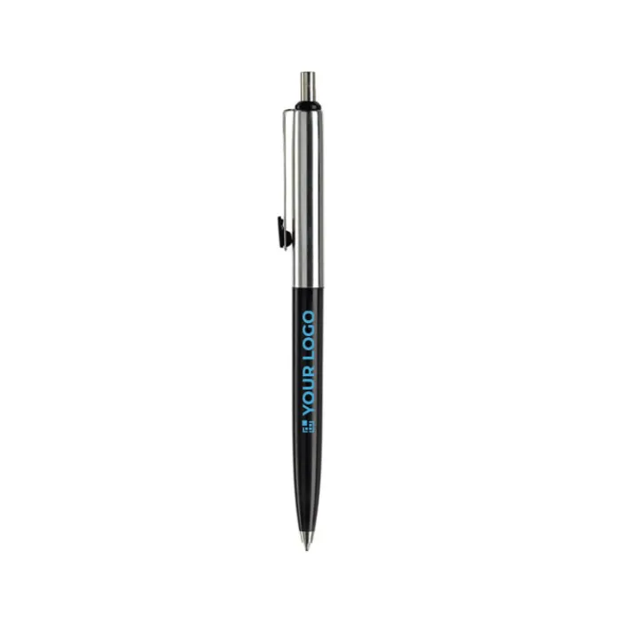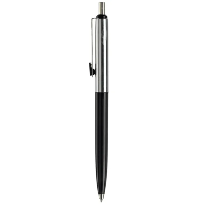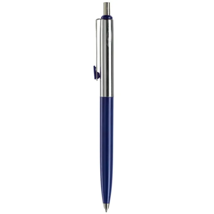 Penna a sfera di metallo con metà fusto colorato e finiture cromate. Inchiostro di lunga durata di colore blu.
