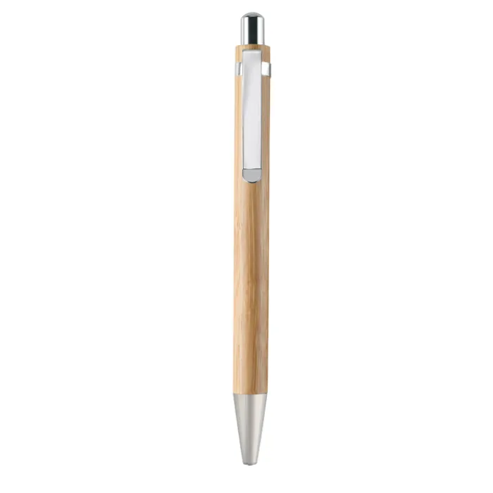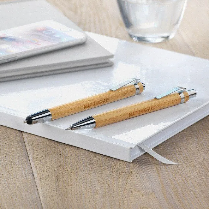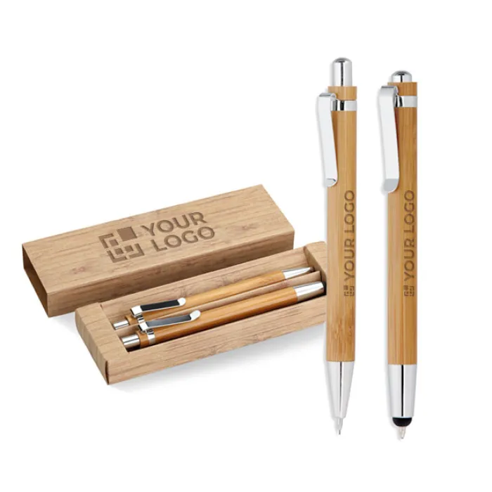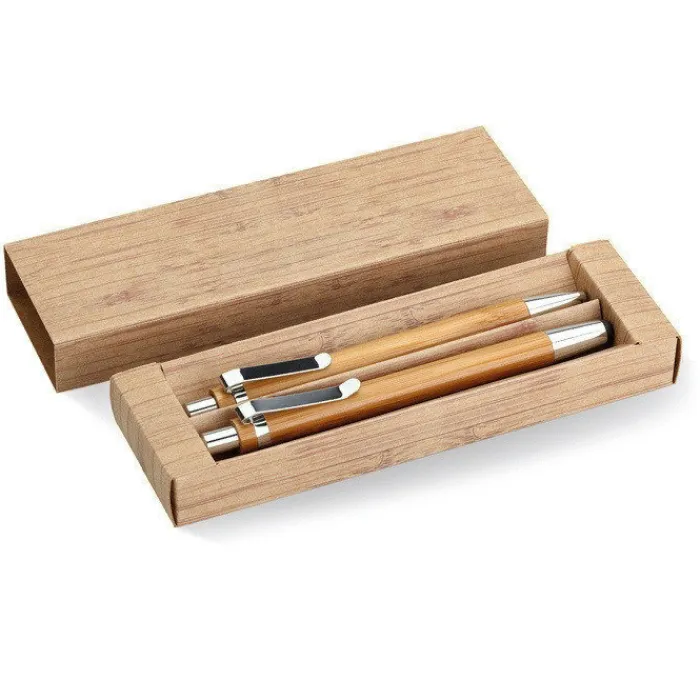 Set con penna a scatto con inchiostro blu e matita a mine, entrambe di bambù contenute in scatola di cartone.
