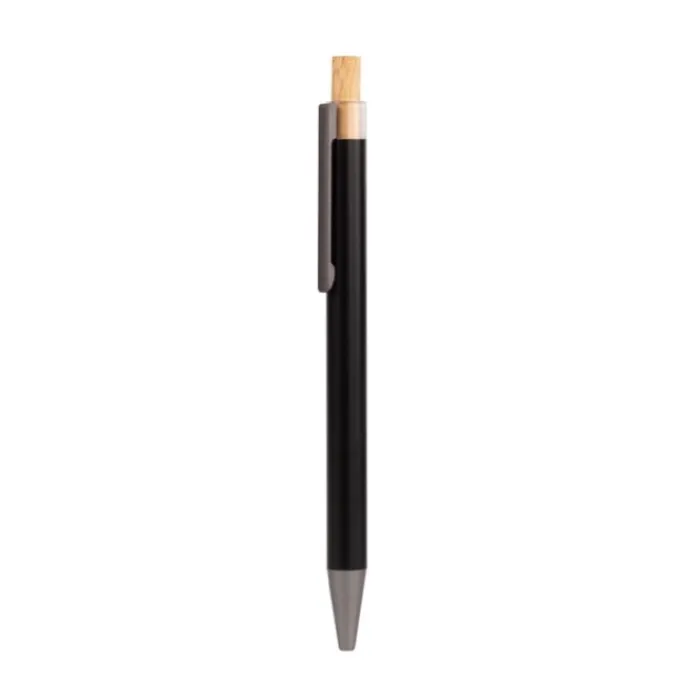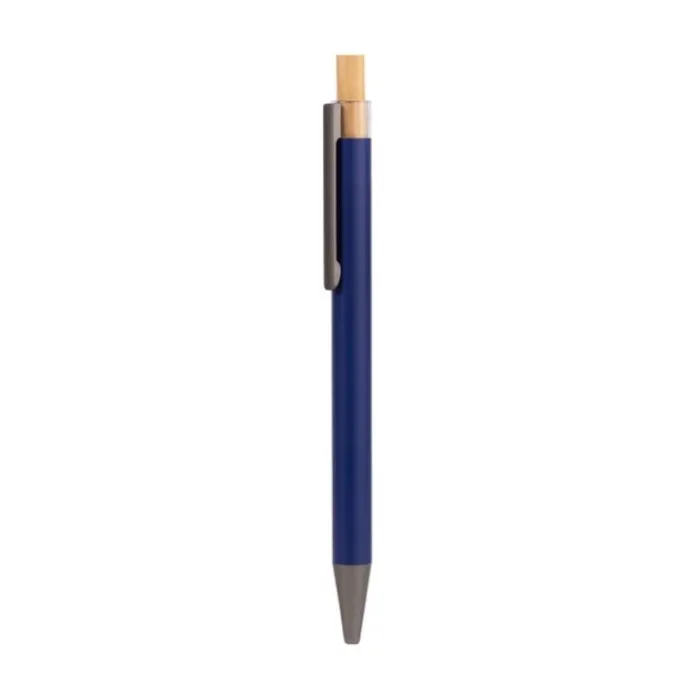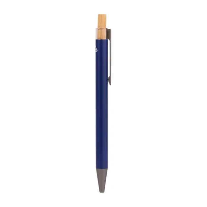 Penna realizzata in alluminio riciclato con finitura opaca e pulsante in bambù. Inchiostro blu.