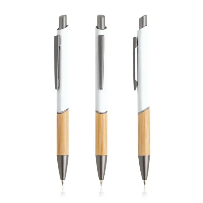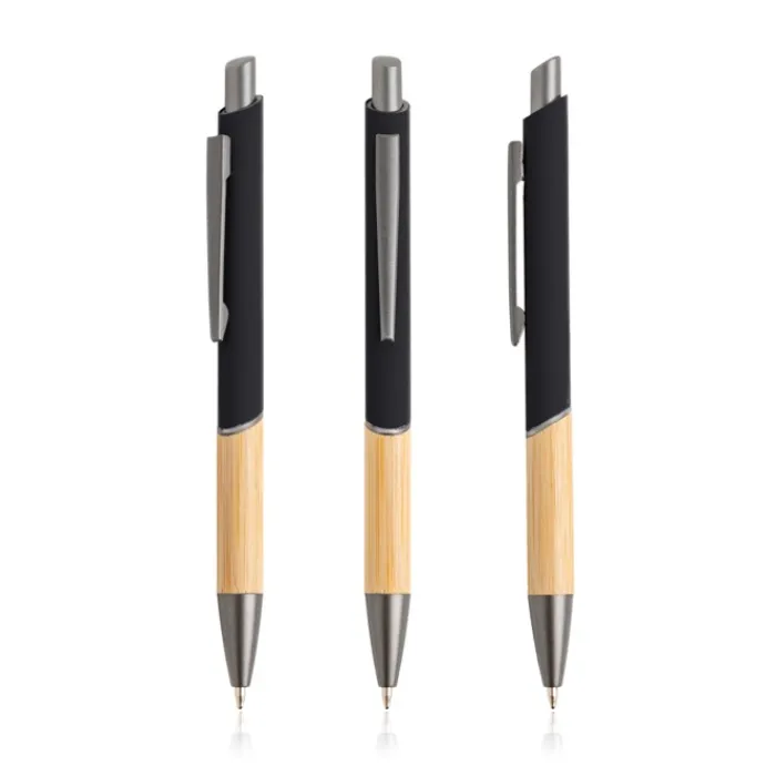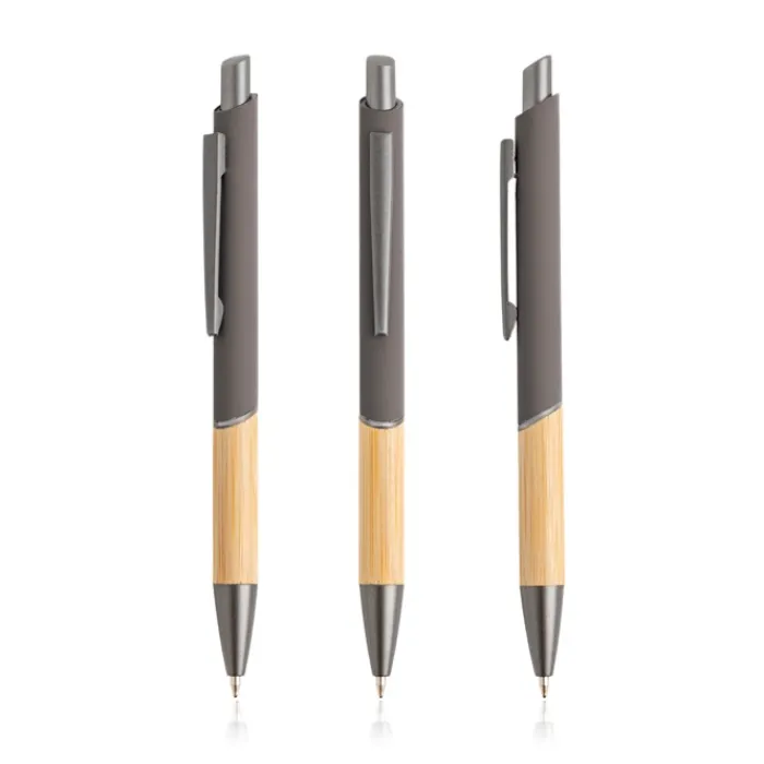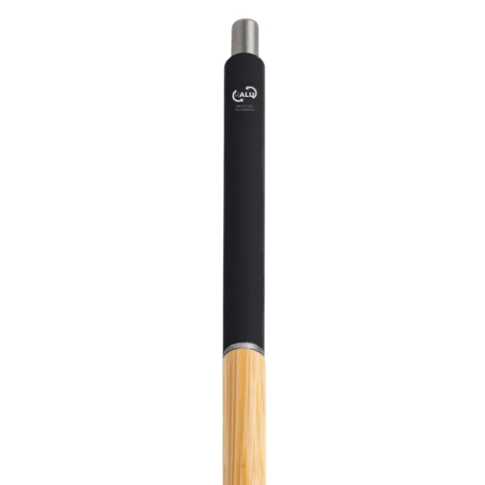 Penna in alluminio riciclato. Acquistandola, contribuisci a ridurre i rifiuti. Design moderno che unisce metallo riciclato, grip gommato e bambù naturale. Scrittura blu.