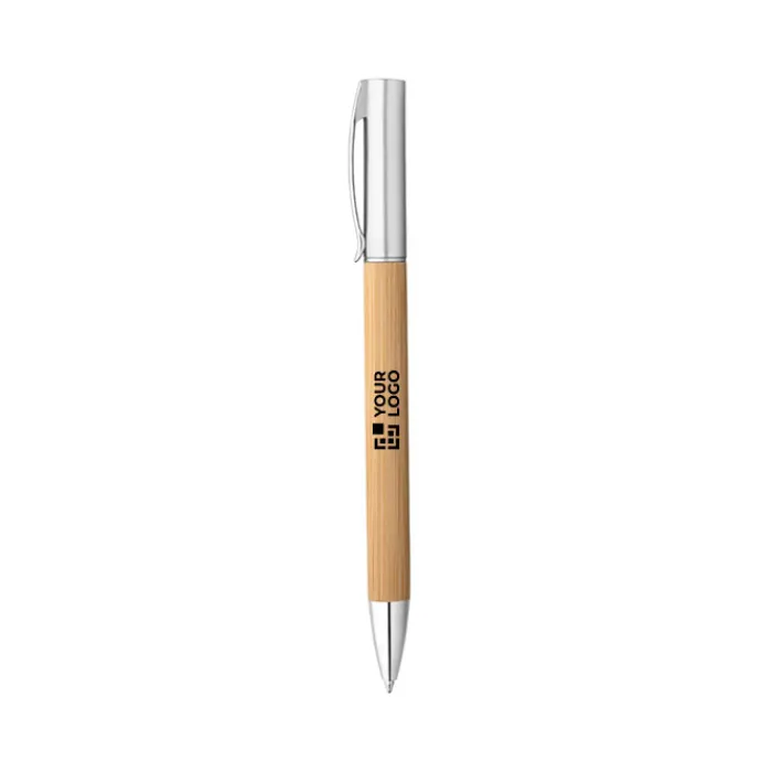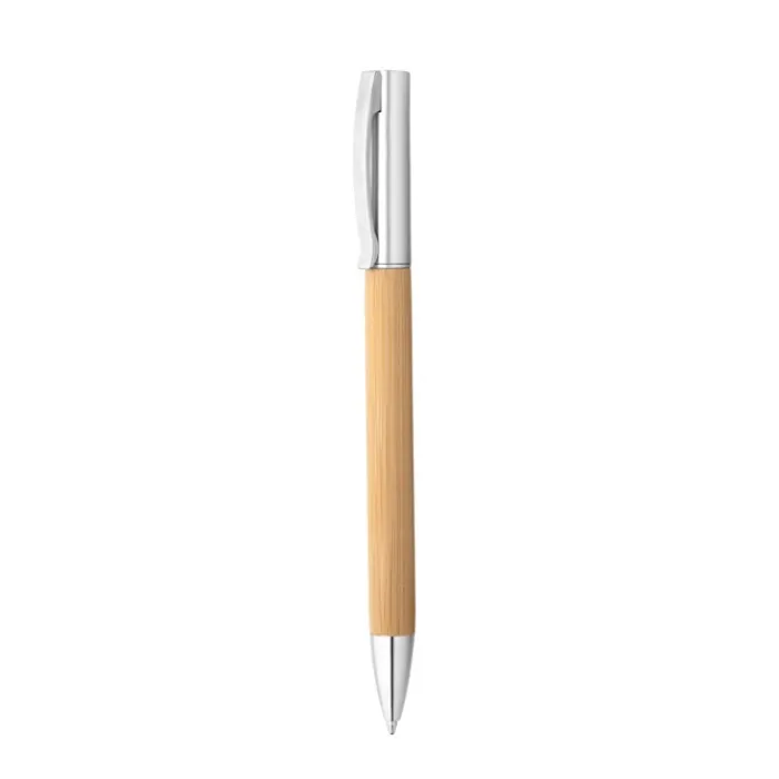 Penna a sfera in bambù e ABS con finitura metallica opaca. Dotata di meccanismo a rotazione e clip metallica. Inchiostro blu.
