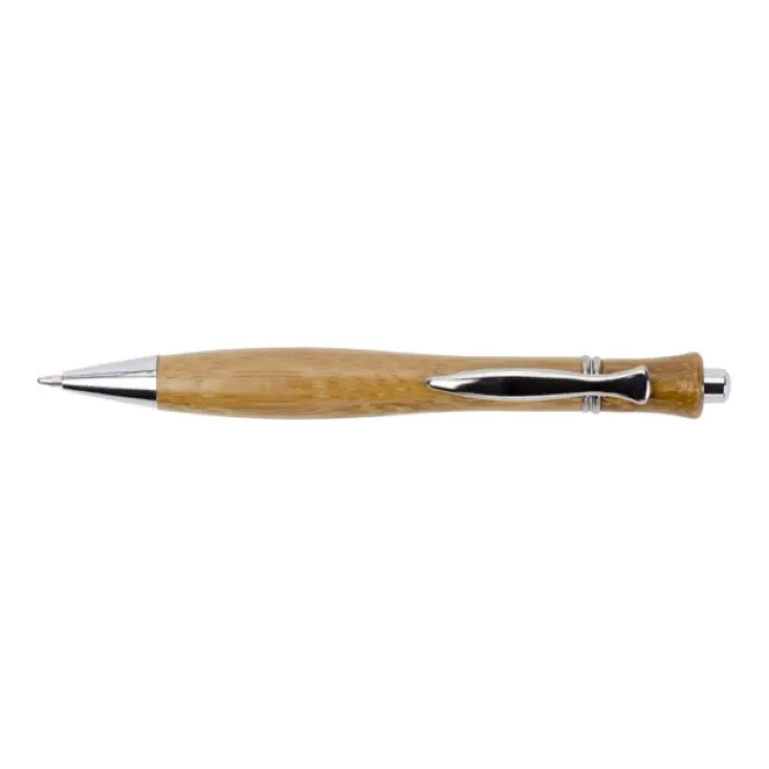 Penna a sfera con meccanismo a scatto, esterno in legno e componenti in metallo. Inchiostro nero.