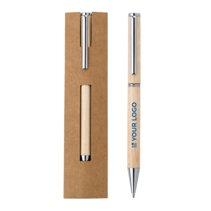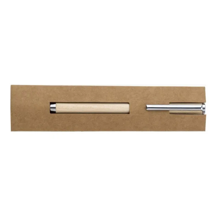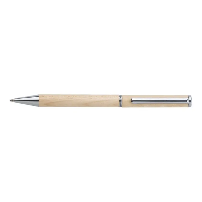 Penna a sfera in legno di acero con clip in metallo e meccanismo a rotazione. Inchiostro German Dokumental blu. Presentata in una custodia marrone.