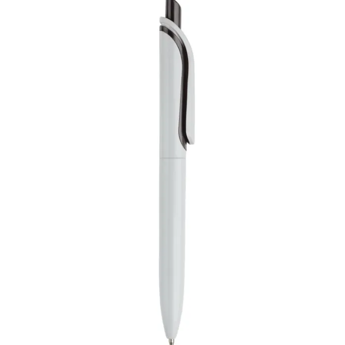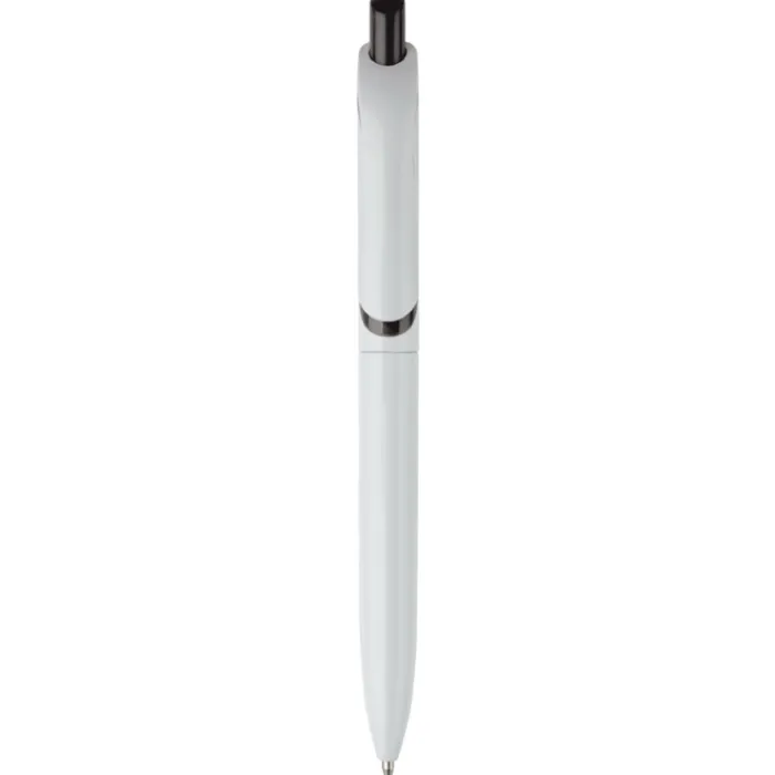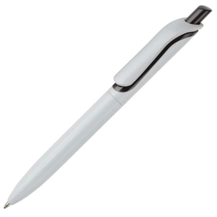 Penna a sfera in plastica ABS. Corpo bianco con dietro clip e pulsante colorato. Cartuccia Jumbo con inchiostro blu. Completamente prodotta in Germania.