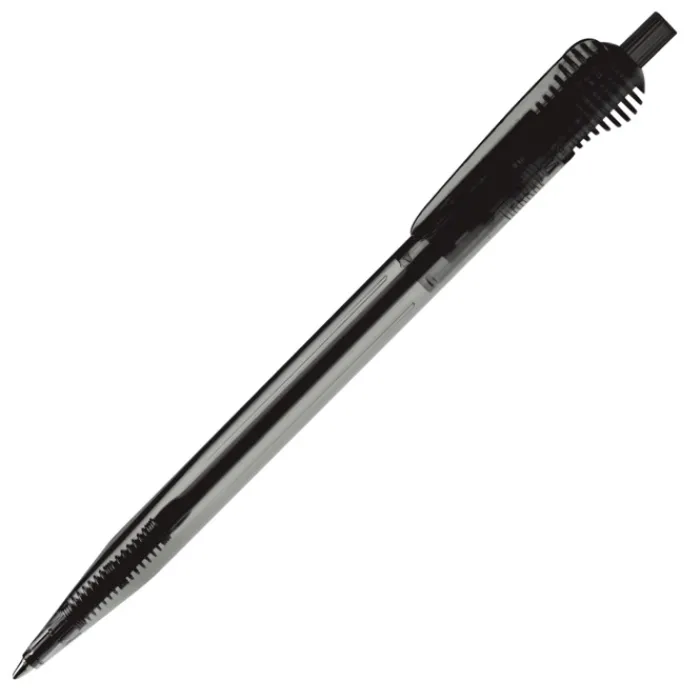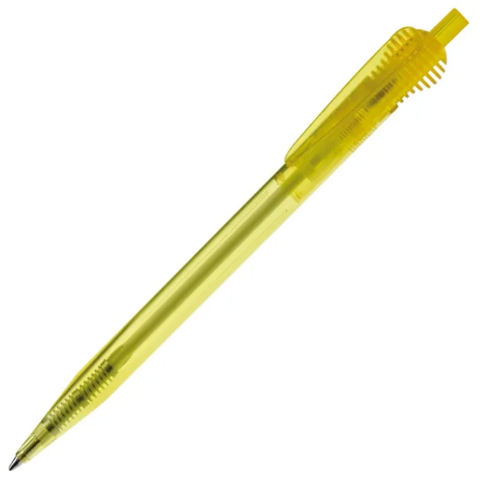 Penna a sfera in plastica colorata trasparente con particolare clip. Cartuccia X-20 in plastica con inchiostro blu.