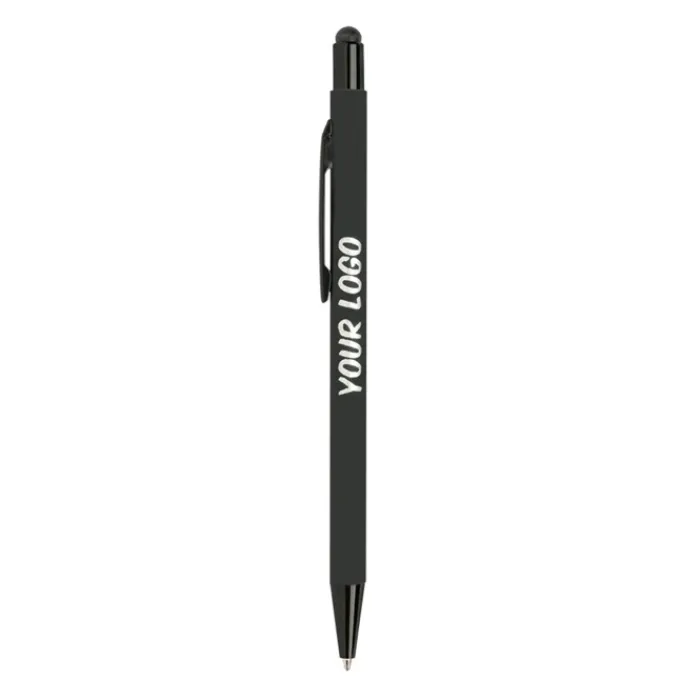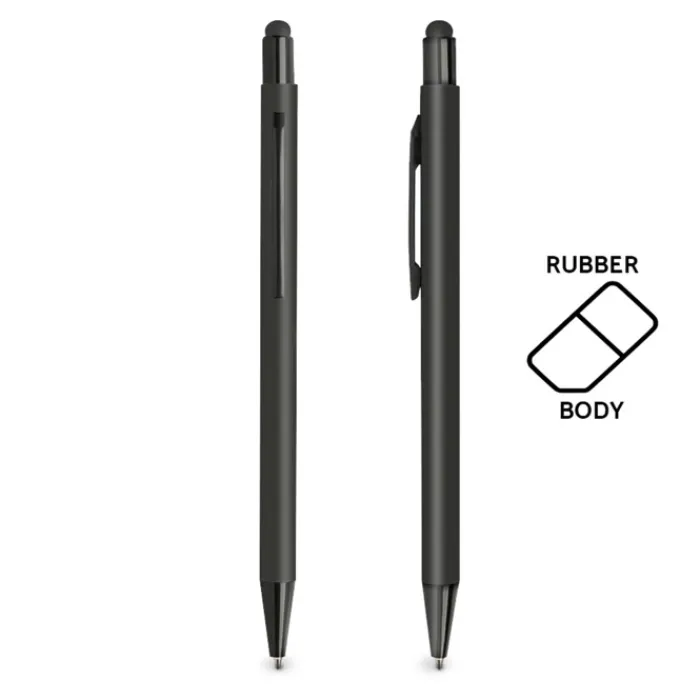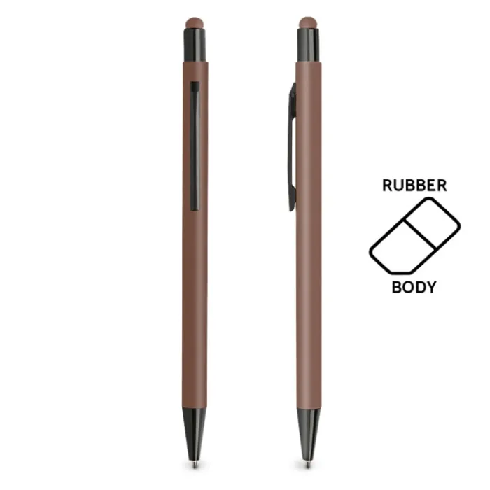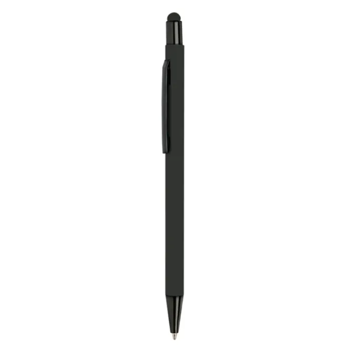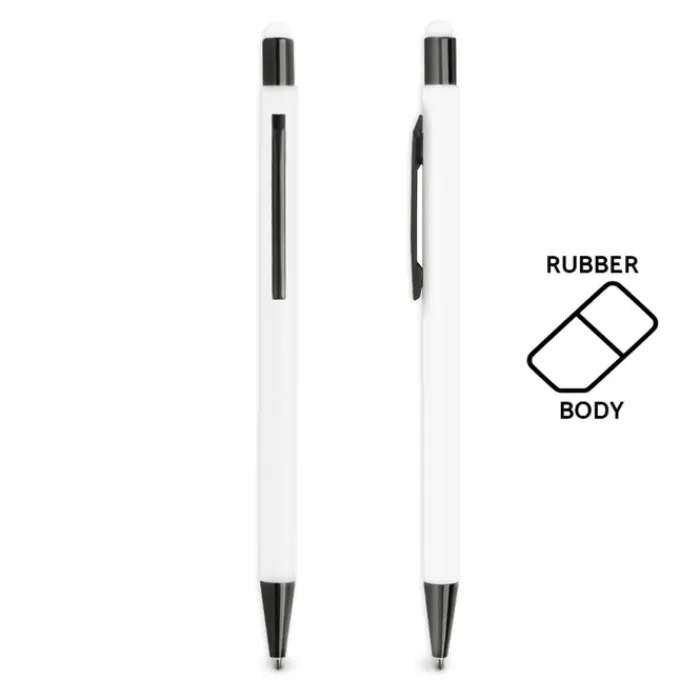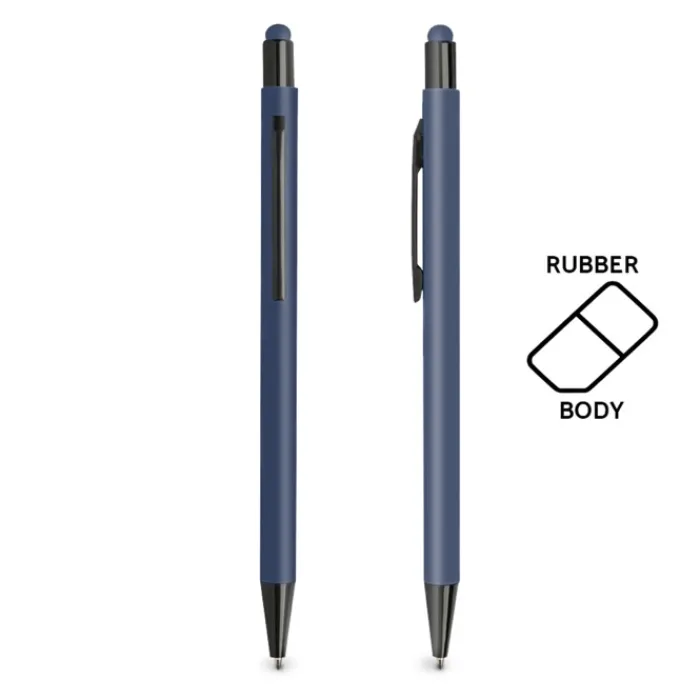 Penna in alluminio, dal corpo sottile e tocco delicato in gomma. Con gommino touch screen, sistema a pulsante e inchiostro blu. Personalizza e guarda il riconoscimento del tuo marchio passare di mano in mano.