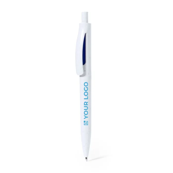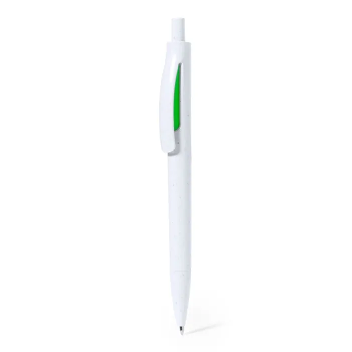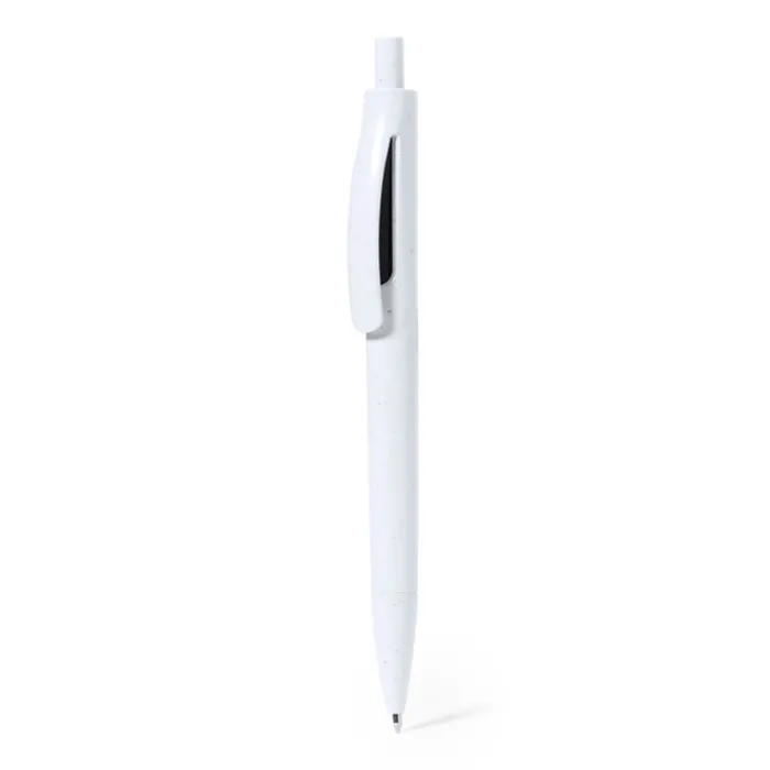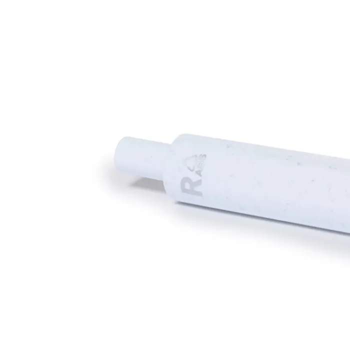 Penna con meccanismo a pulsante realizzata in ABS riciclato. Dettaglio colorato sotto la clip. Fusto liscio e solido di colore bianco con puntini grigi derivanti dall’utilizzo di plastica riciclata. Sulla parte superiore riporta la scritta dell’ABS riciclato. Inchiostro blu.