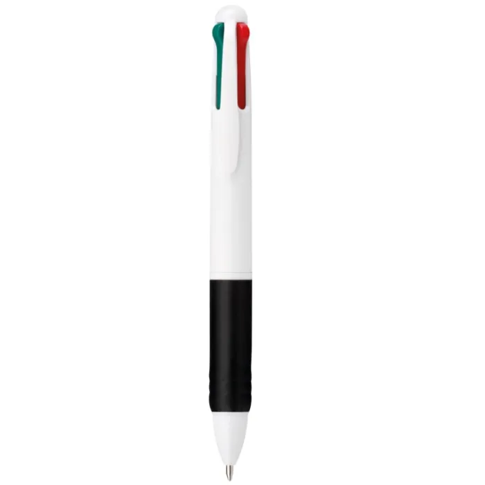 Penna in plastica con impugnatura in gomma e 4 inchiostri differenti: blu, rosso, verde e nero.
