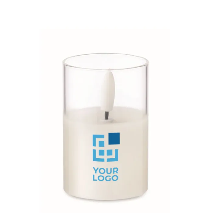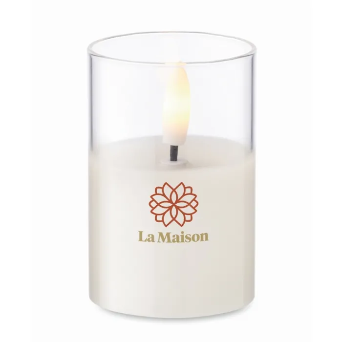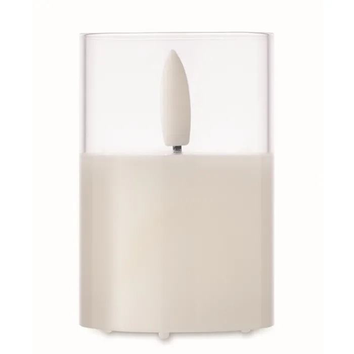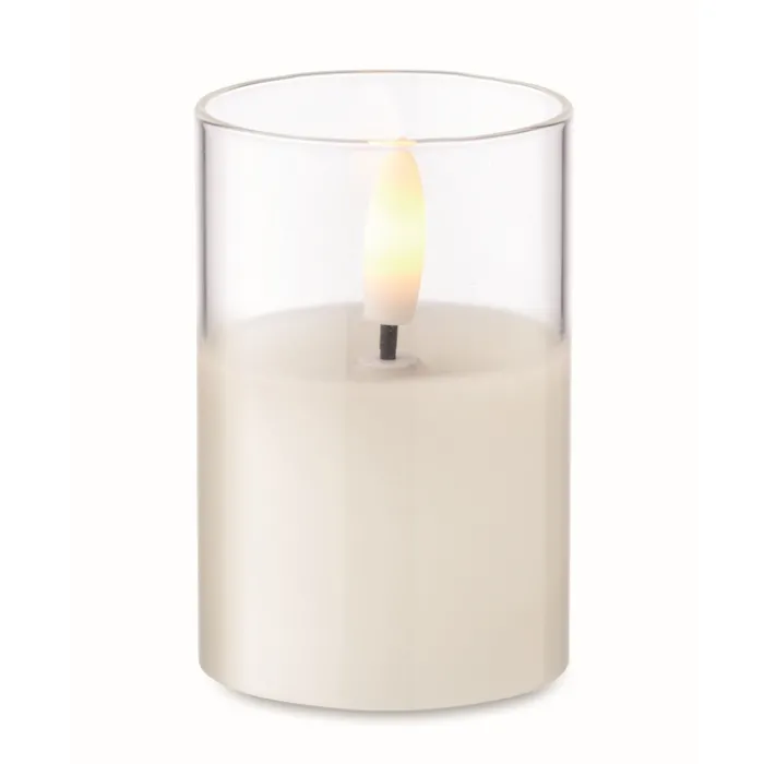 Candela elettrica con luce a LED con effetto fiamma reale. Contenuta in un bicchierino di vetro. Funziona con 1 batteria CR2032 inclusa.