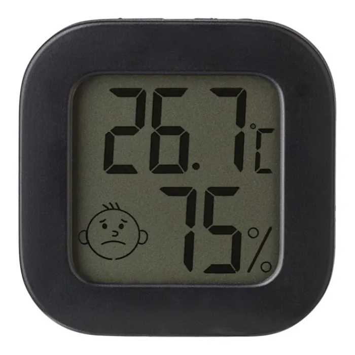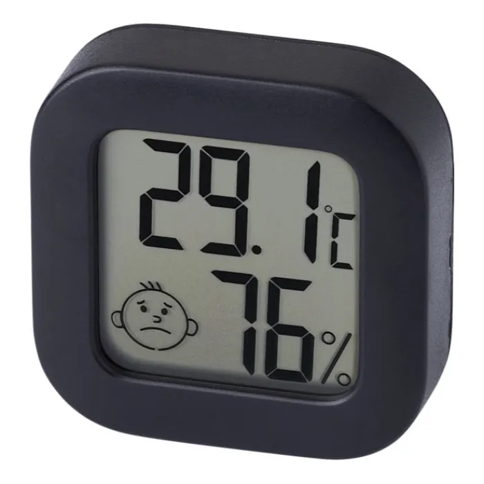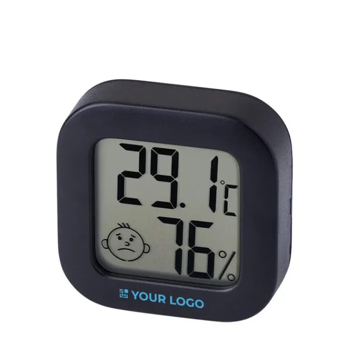 Igrometro da scrivania in ABS. Indica la temperatura e l’umidità. Ha un adesivo sul retro per poterlo attaccare al frigorifero, ad una finestra o dove vuoi. Funziona con 1 batteria Cell-CR2032, che viene inclusa. Presentato in una scatola di cartone bianco.