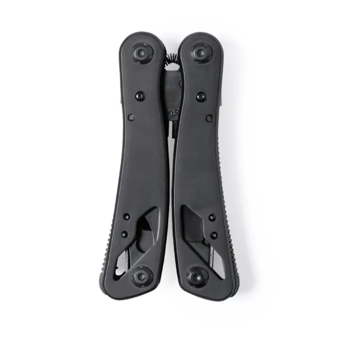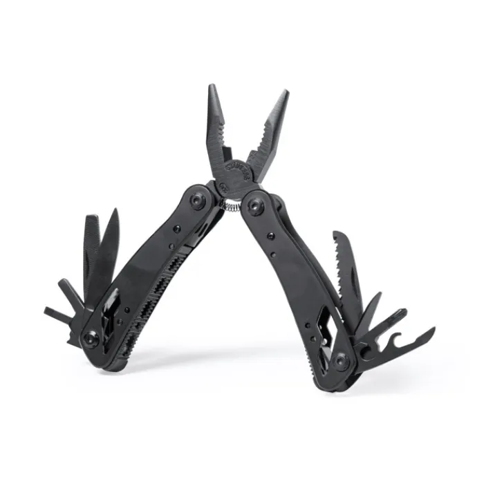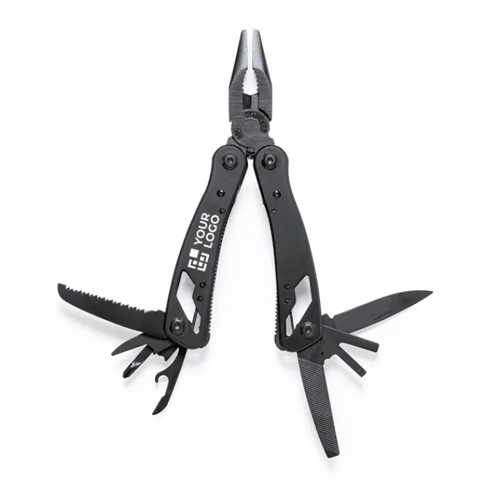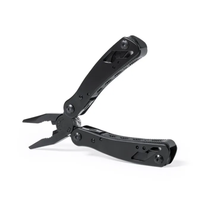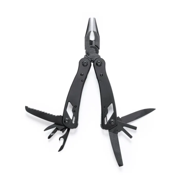 Multi utensile pieghevole e compatto, con accessori in acciaio inox nero e robusta impugnatura in alluminio abbinata. Con 13 funzioni, tra cui coltello, cacciavite, lima, apriscatole e pinze. Presentato in una scatola individuale di design nera.