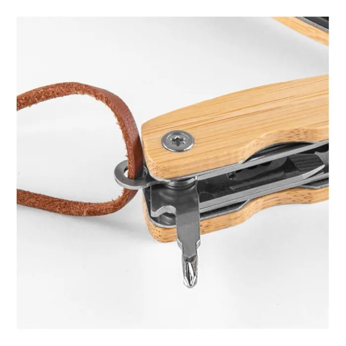Multi utensile dal corpo in acciaio inox e bambù. Dispone di 9 funzioni ed un cordino decorativo in similpelle.