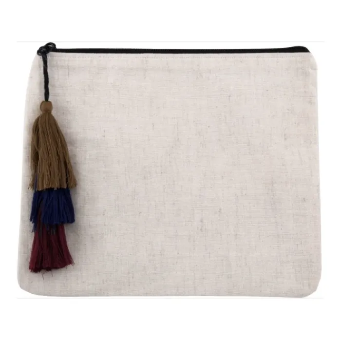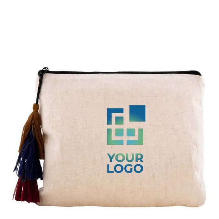 Pochette in canapa da 200 gr/m² con nappine decorative sul manico della cerniera.