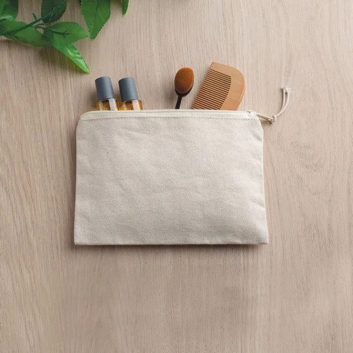 Pochette in 100% cotone da 310g/m² con chiusura zip in nylon. Gadget insostituibile e fondamentale in ogni tipo di viaggio. Ideale per conservare cosmetici e altri oggetti di piccole dimensioni, è realizzato con cotone di qualità per assicurare resistenza e praticità. Può essere abbinato ad altri accessori per creare un kit da viaggio sempre utile.