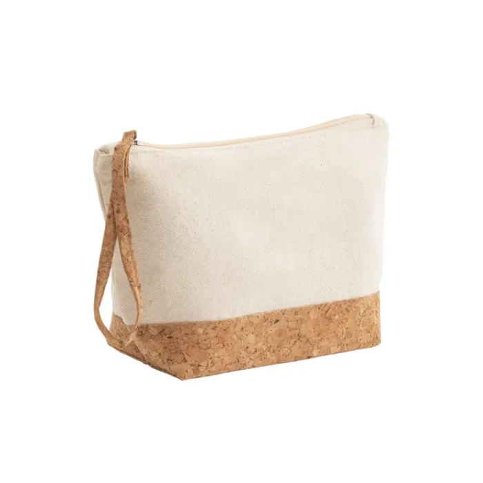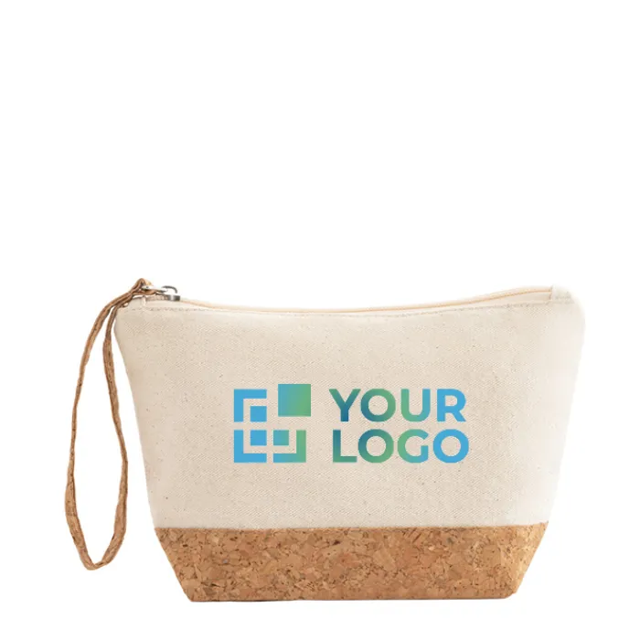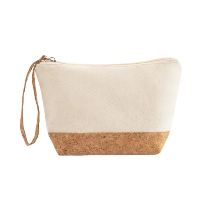 Porta trucchi in cotone 100% (da 280 g/m²) con fondo e cinturino in sughero. L’interno è foderato, facile da pulire e da asciugare.