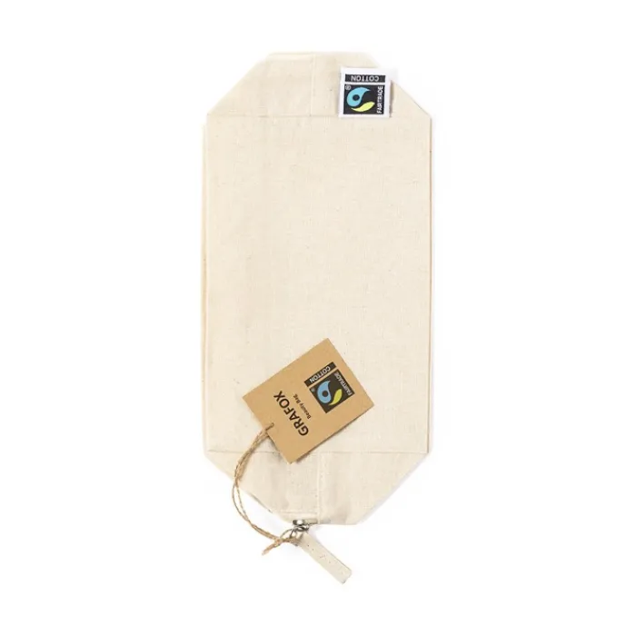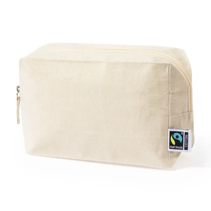 Pochette realizzata al 100% in cotone da 180g/m² in tono naturale. Scomparto principale con chiusura a zip e tiretto abbinato. Ha la certificazione Fairtrade (commercio equo e solidale), un sistema alternativo al commercio convenzionale che persegue lo sviluppo dei popoli e la lotta contro la povertà. Lateralmente ha l’etichetta del Fair Trade e del cotone riciclato.