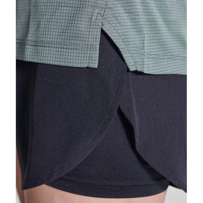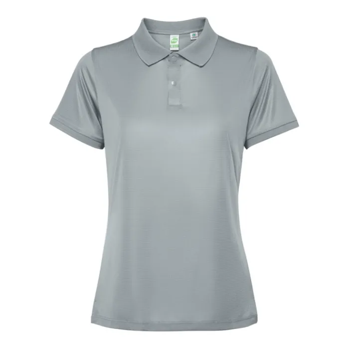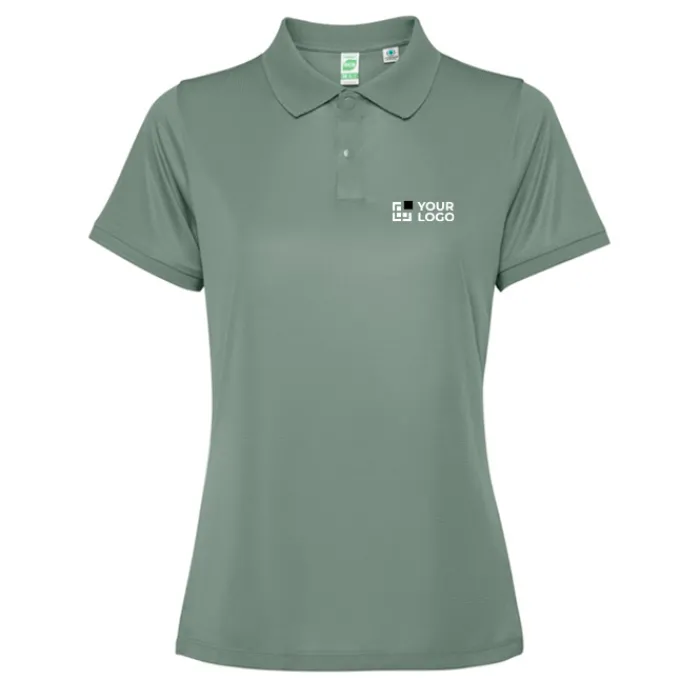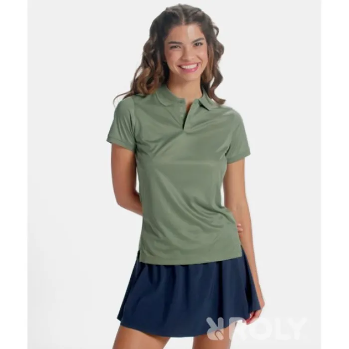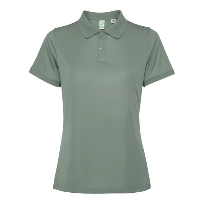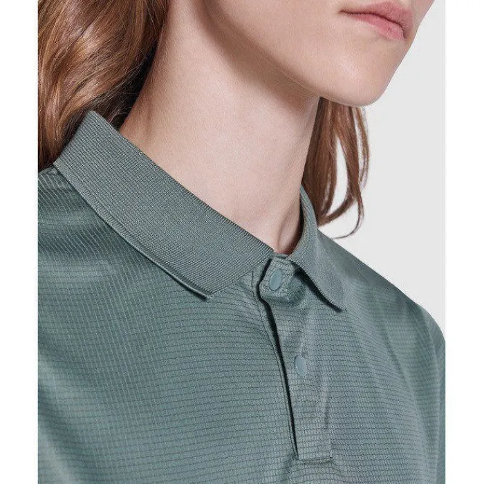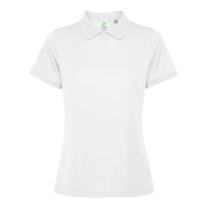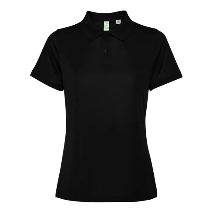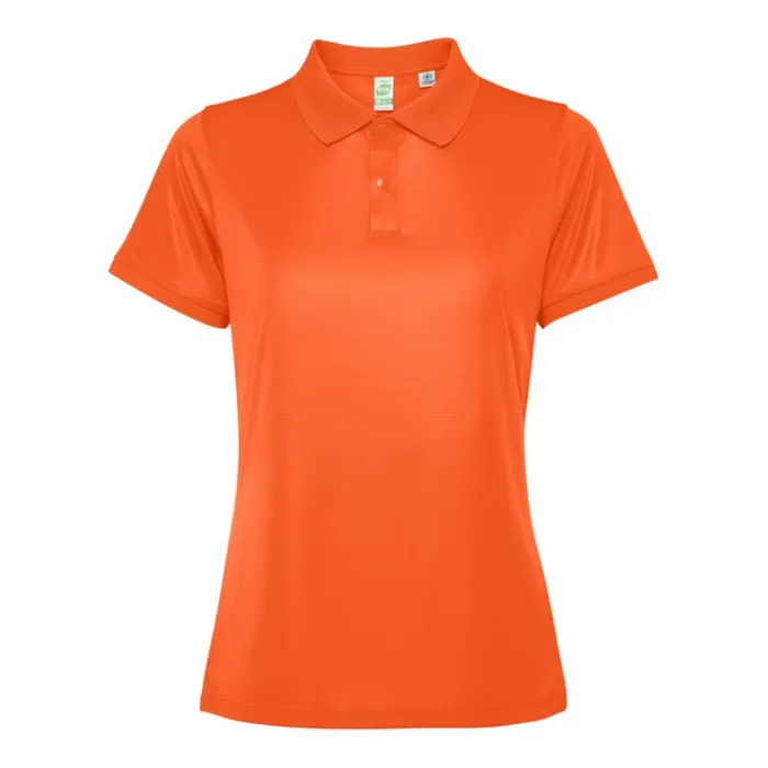 Polo tecnica aderente a maniche corte da donna. Colletto in poliestere a costine 1×1 con bottoni a pressione in plastica, in tinta con l’allacciatura. Copricuciture abbinate e maniche con finitura coordinata a costine 1×1.