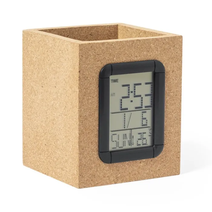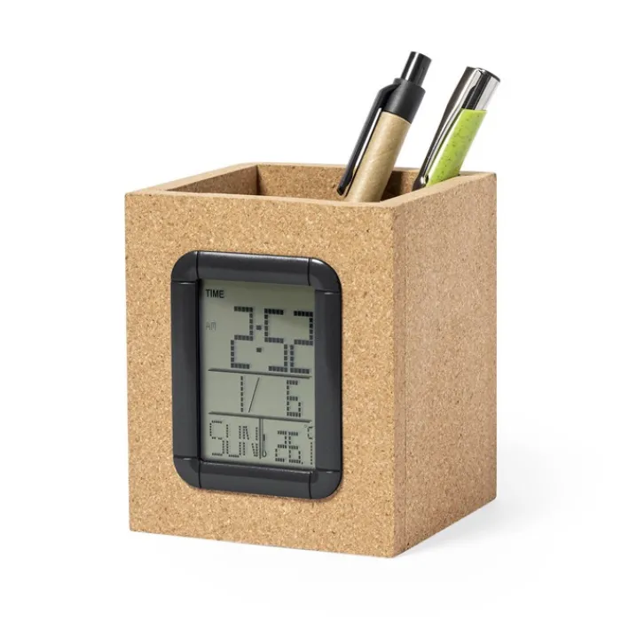 Porta penne con orologio multifunzione integrato con funzioni di termometro, calendario e allarme. Prodotto in sughero naturale. Alimentato con batterie a bottone incluse. Confezionato in un’attraente scatola di eco-design.