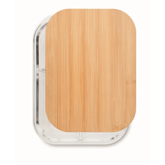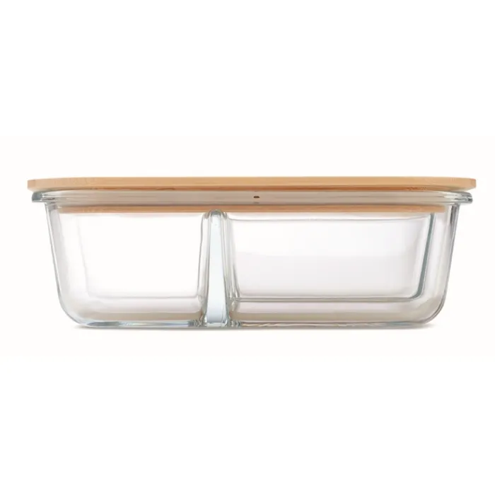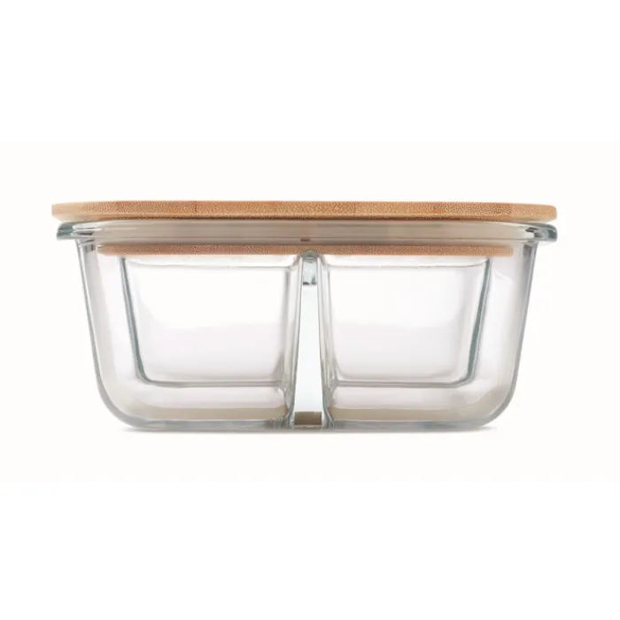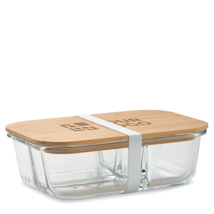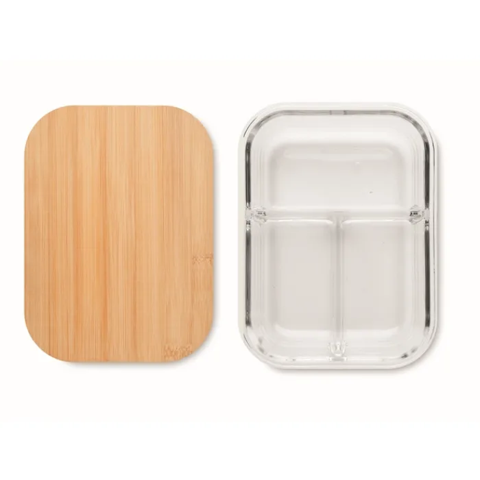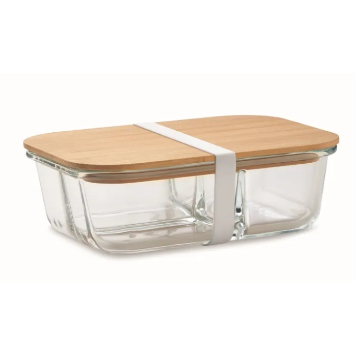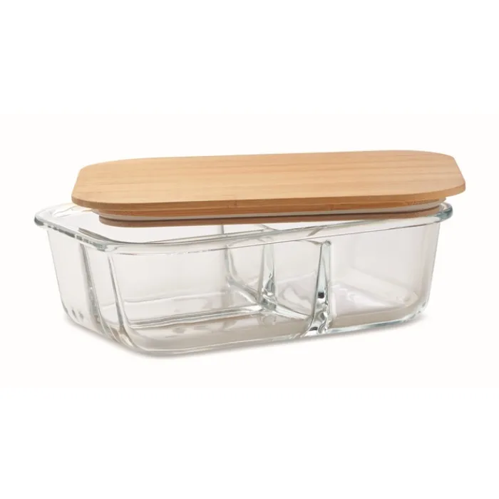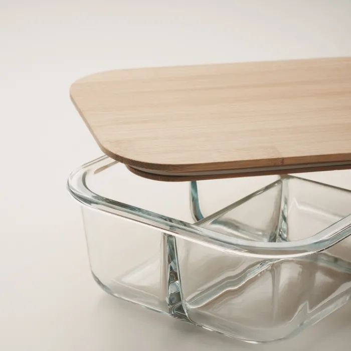 Porta pranzo in vetro borosilicato con 3 scomparti, coperchio in bambù e fascia in silicone. Capacità: 800 ml. Il bambù è un materiale naturale, per cui a causa della sua struttura e della porosità della superficie, il colore del coperchio potrebbe variare leggermente tra un contenitore e l’altro.