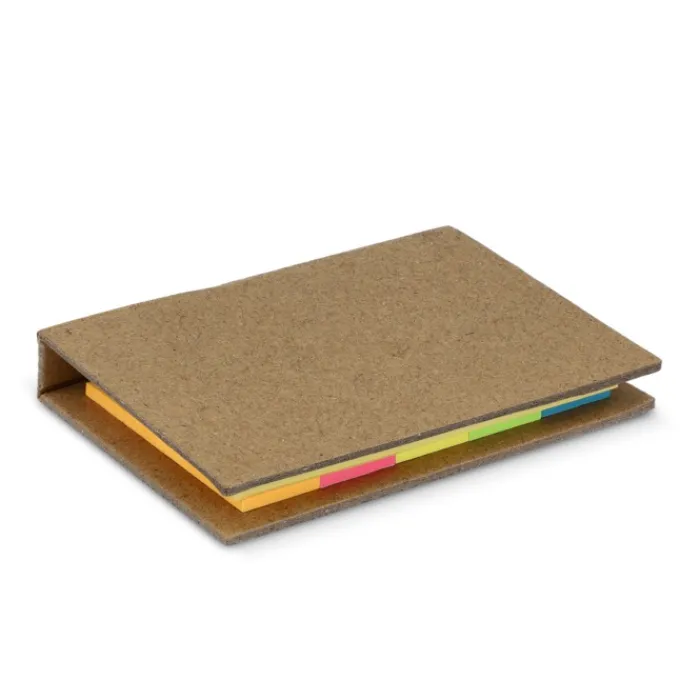 Questo portablocco sostenibile, realizzato in carta kraft, contiene due dimensioni di post-it: 50 fogli da 75 x 49 mm e 125 fogli da 49 x 14 mm (25 fogli ciascuno in cinque colori). Un accessorio pratico per organizzare idee e promemoria.