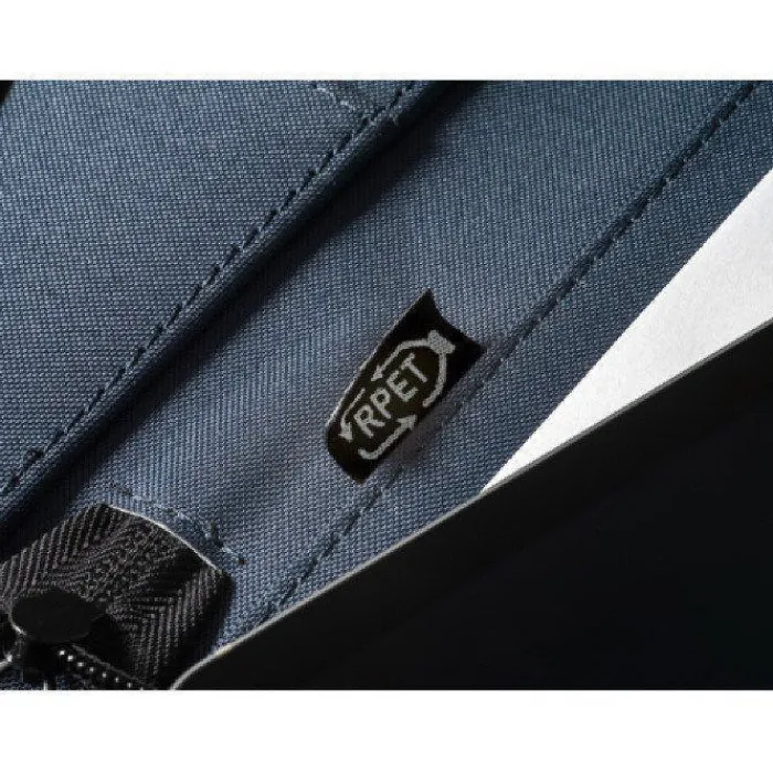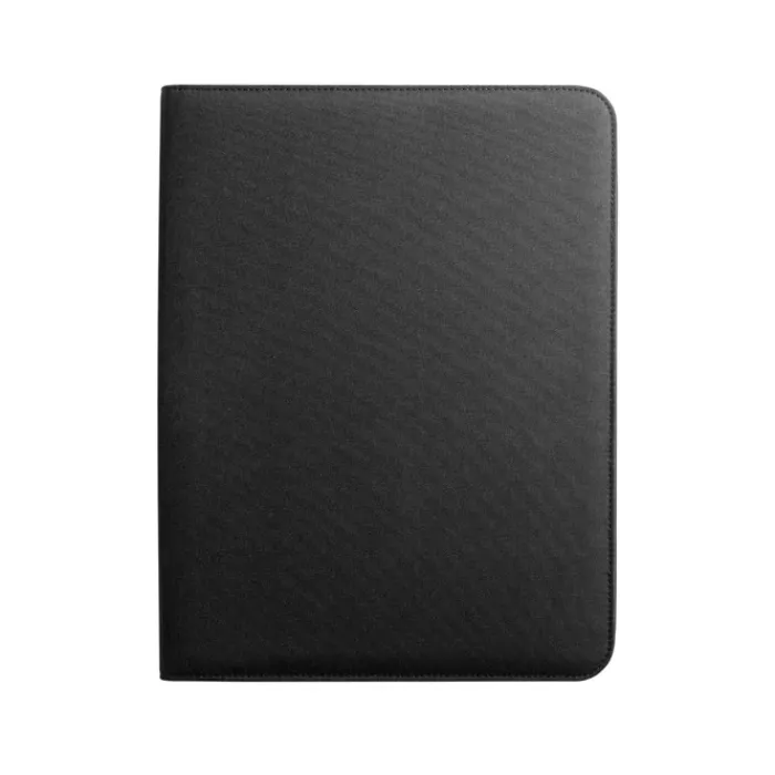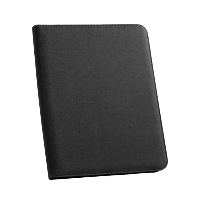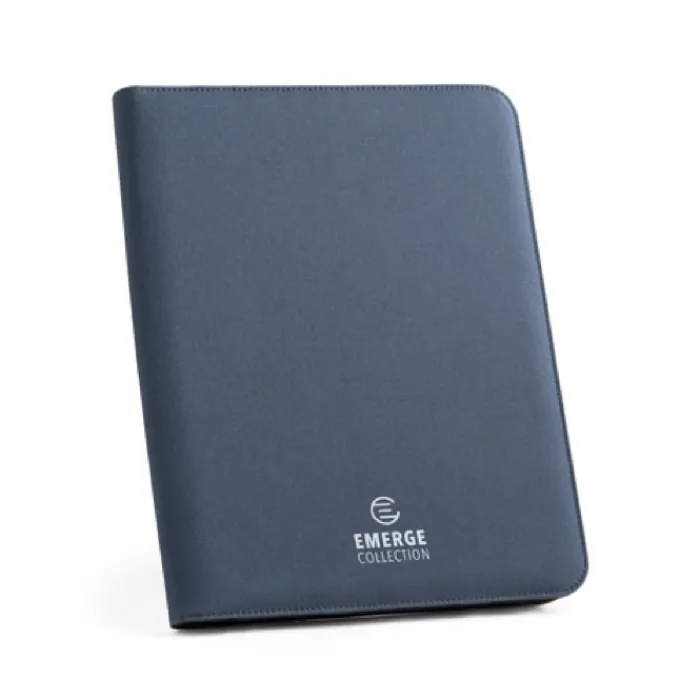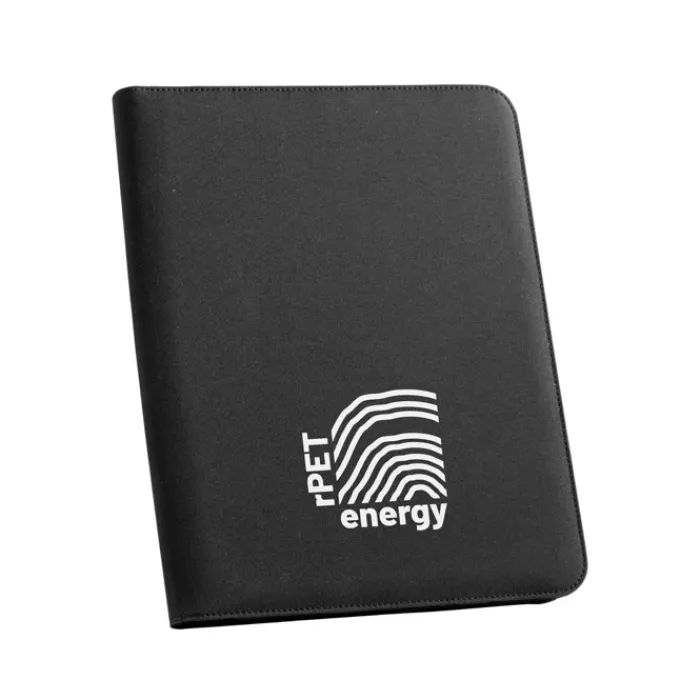 Cartella formato A4 in rPET 300D con cerniera. Interno in 210D rPET con tasche multiple. Scomparto per smartphone fino a 6,5”, anello portapenne nel mezzo e block notes con 20 fogli bianchi di carta certificata FSC. Fornito in un sacchetto di tessuto non tessuto.