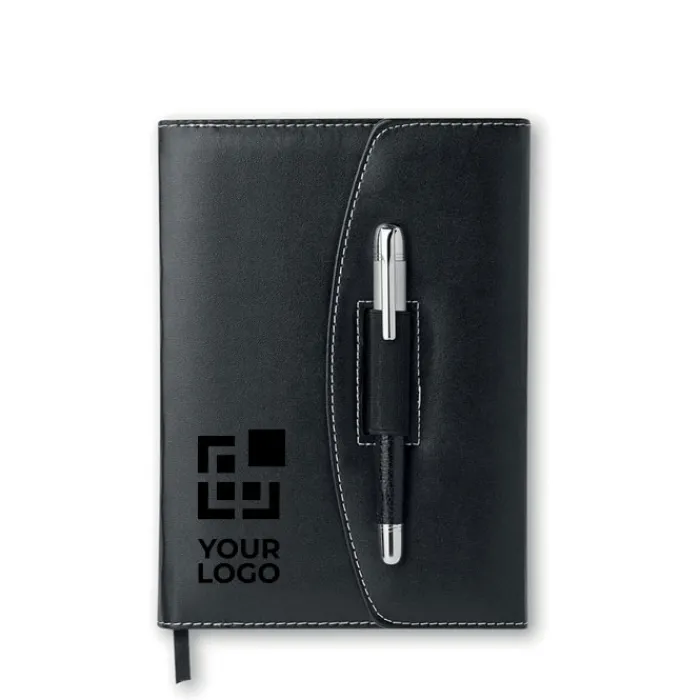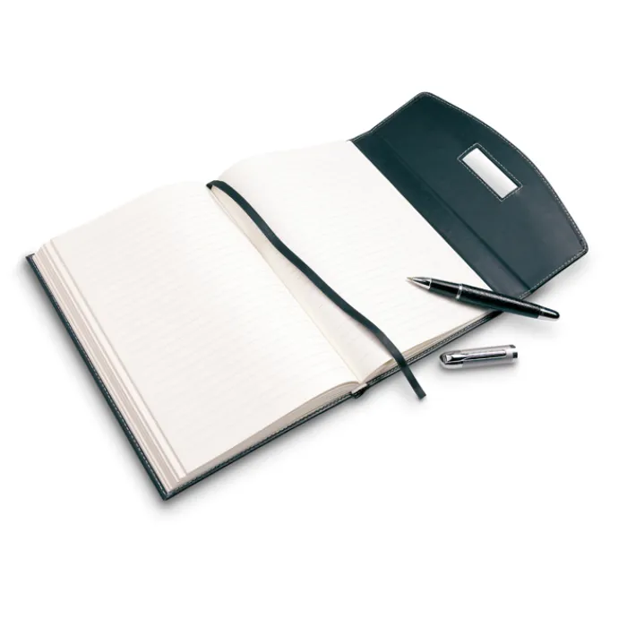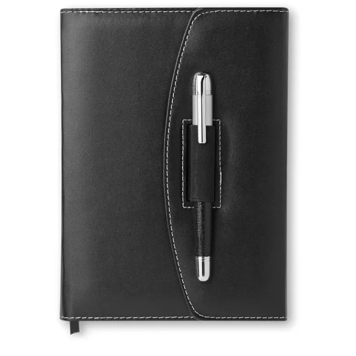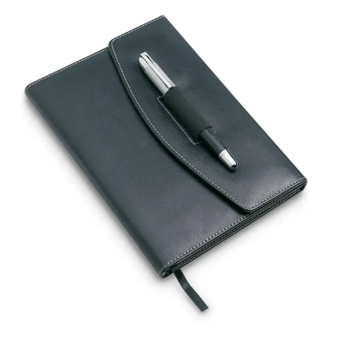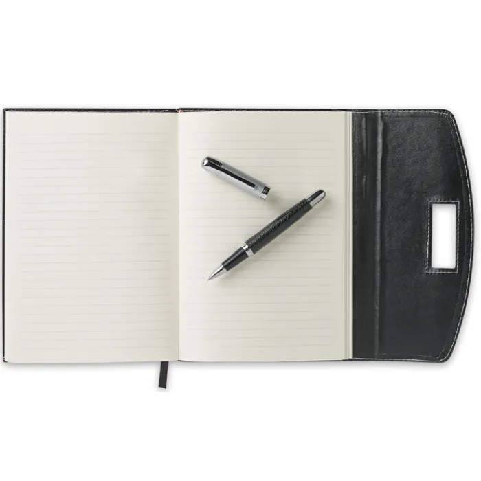 Portadocumenti in formato A5 con blocnotes 120 fogli a righe e penna in metallo con refill nero. In PU.