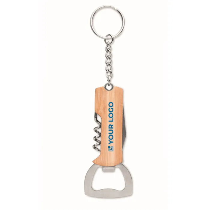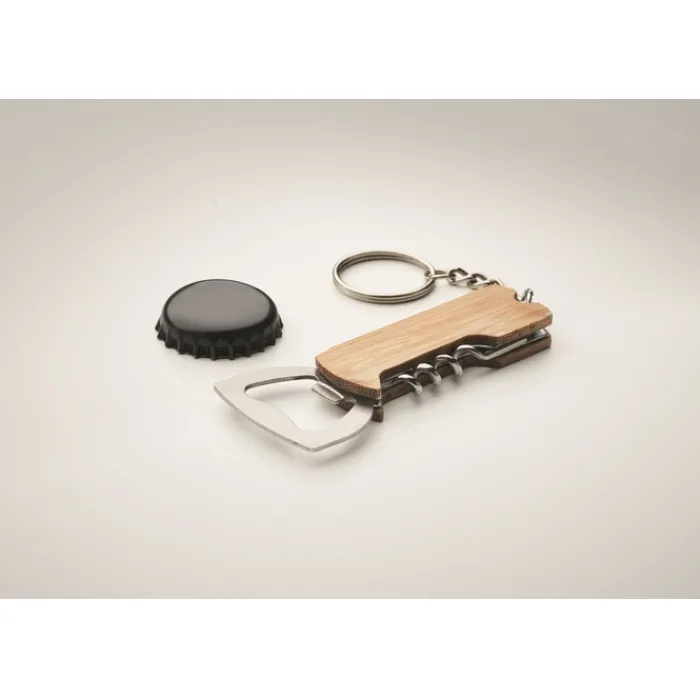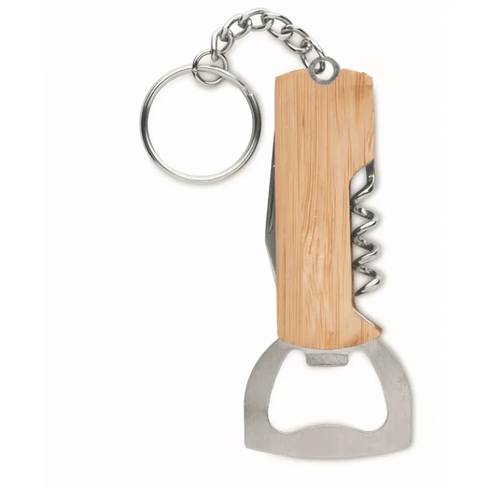 Portachiavi a forma di apribottiglie con cavatappi e coltellino in acciaio inossidabile e bambù.