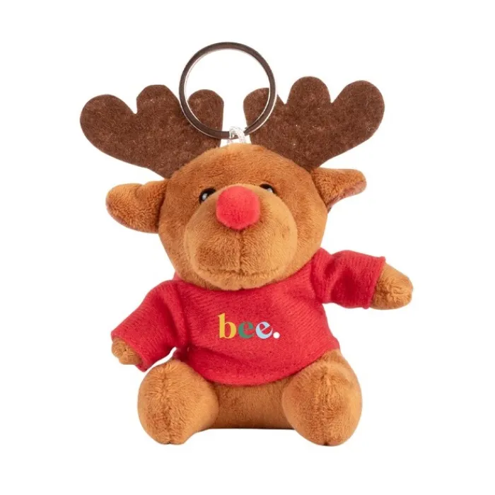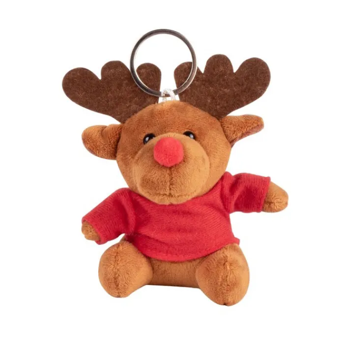 Portachiavi con renna di peluche di poliestere che indossa una maglietta personalizzata. Conforme alla normativa EN71.