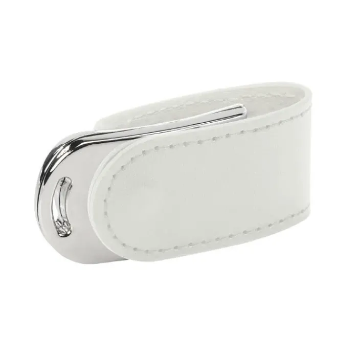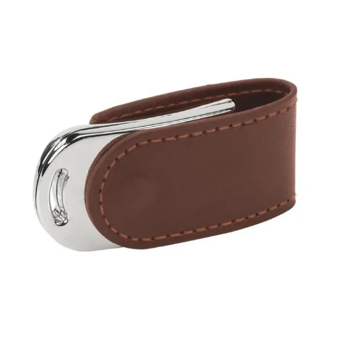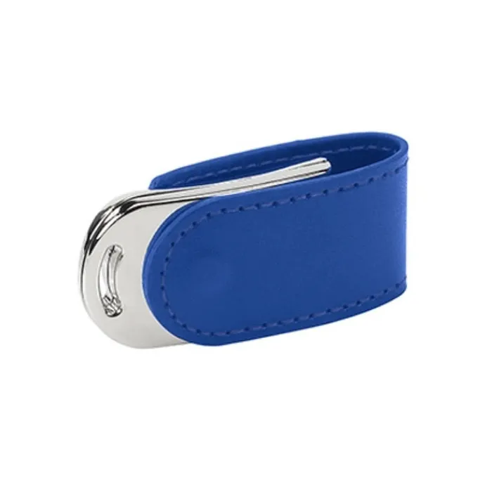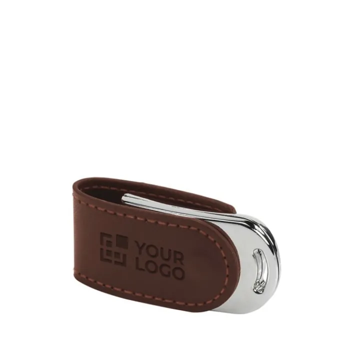 Elegante e raffinata memoria USB in metallo e similpelle con chiusura magnetica. In pratica la parte in pelle avvolge la pendrive come una clip, che invece di ruotare si apre da un alto per poter infilare il chip nella porta USB. Questa chiavetta USB può essere personalizzata con il vostro logo o con il vostro messaggio promozionale attraverso una stampa a colori, un’incisione laser, oppure con una innovativa stampa in bassorilievo. È disponibile in varie capacità di memoria (1 GB, 2 GB, 4 GB, 8 GB, 16 GB, 32 GB e 64GB) per adattarsi a quello che é il vostro budget.