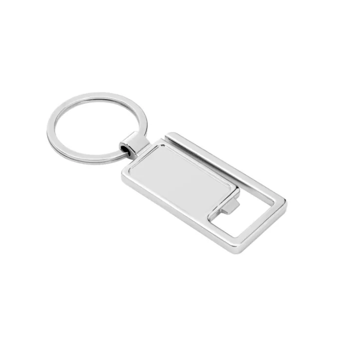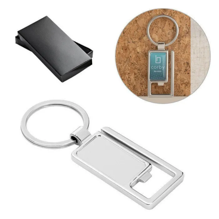 Portachiavi in metallo con taglio per doming. Con apribottiglie e moschettone. Fornito in scatola regalo.