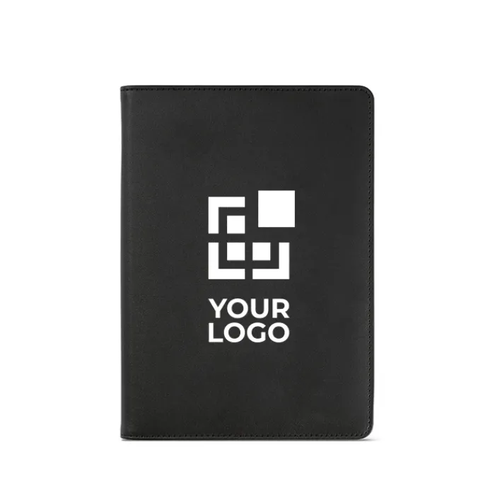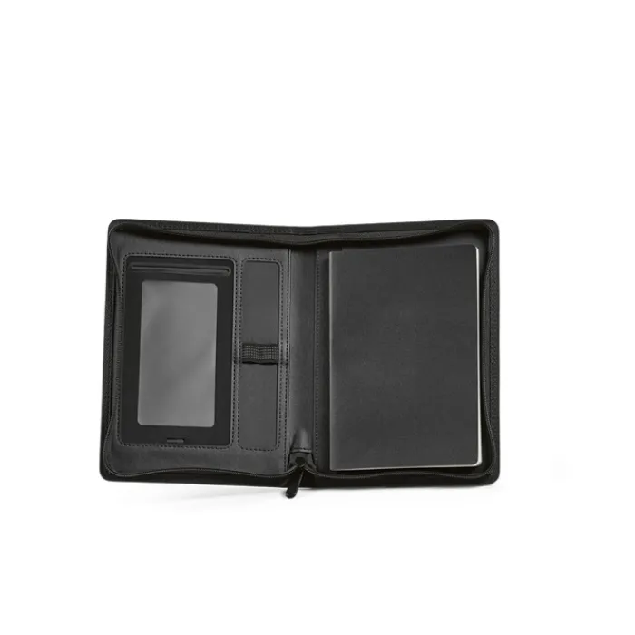 Portadocumenti formato A5 in Pu riciclato con chiusura zip. Contiene un quaderno da 64 fogli di carta tratteggiata FSC di color avorio da 70 g/m², una tasca trasparente per il telefono dalle dimensioni massime di 10 x 18 cm e due anelli portapenne.