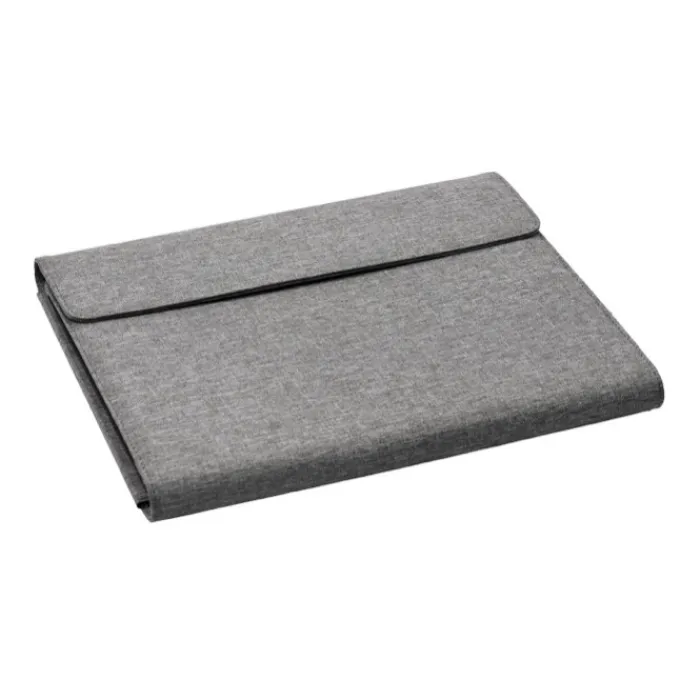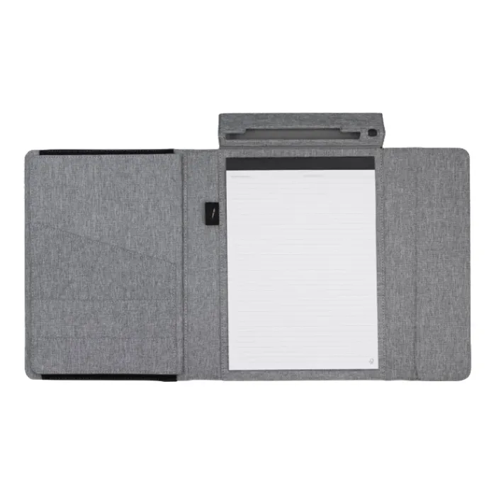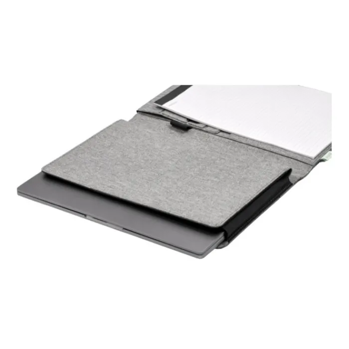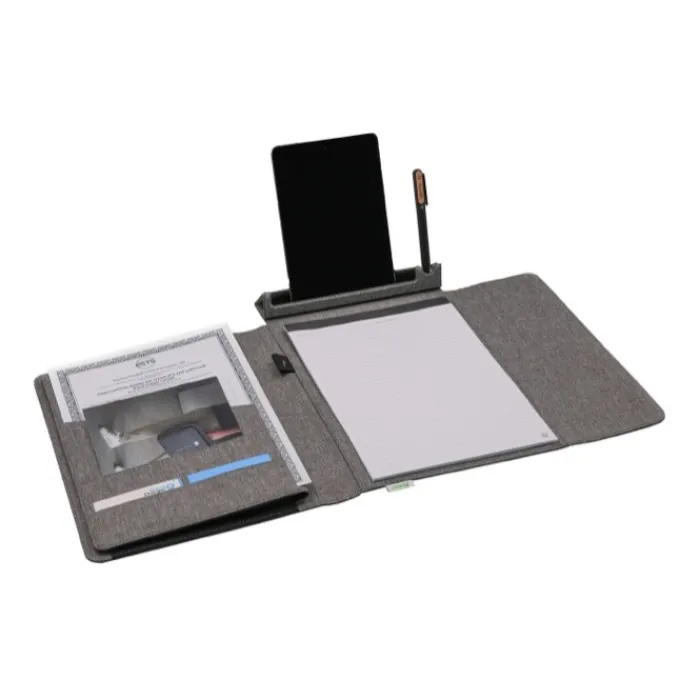 Il portadocumenti realizzato con bottiglie PET riciclate e carta è una cartella aziendale di prima qualità, perfetta per professionisti impegnati e organizzati. Include uno spazio per un blocco note A4, una tasca per tablet o laptop (fino a 13”) e scomparti per oggetti essenziali come biglietti da visita. Questo portafoglio completo ha una chiusura magnetica, copertura rigida e un organizer da scrivania pieghevole. Ideale per chi viaggia frequentemente e per i professionisti in movimento.