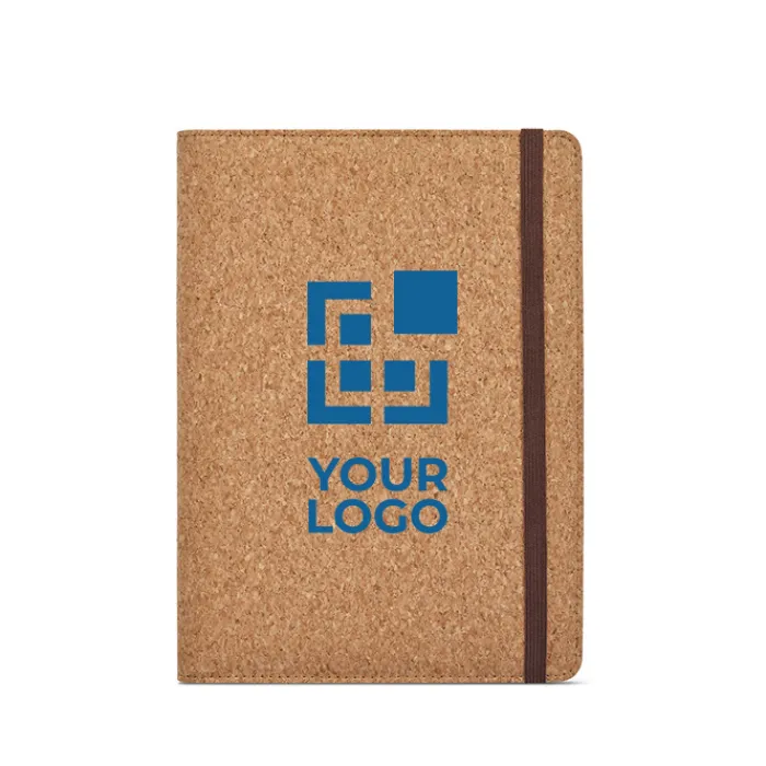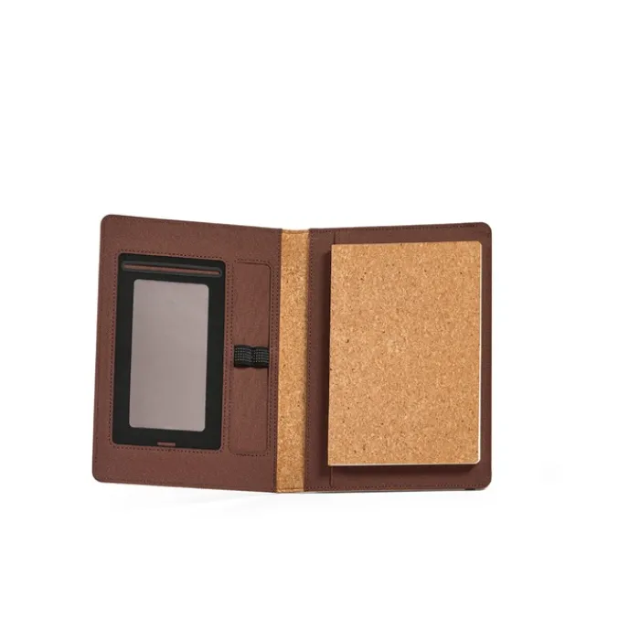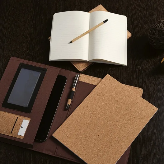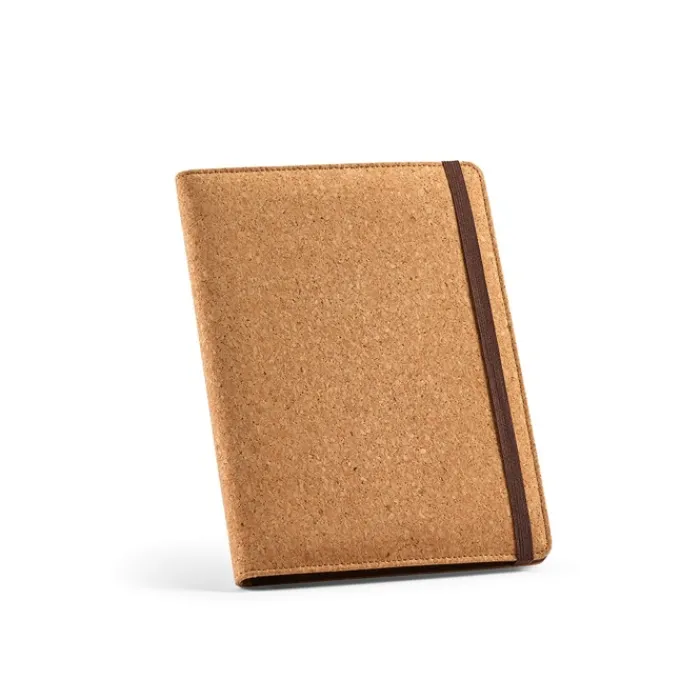 Portadocumenti formato A5 in sughero con chiusura elastica. Contiene un quaderno da 64 fogli di carta tratteggiata FSC di color avorio da 70 g/m², una tasca trasparente per il telefono dalle dimensioni massime di 10 x 18 cm e due anelli portapenne.