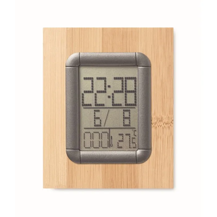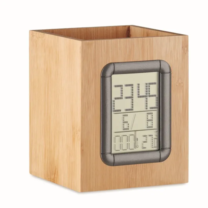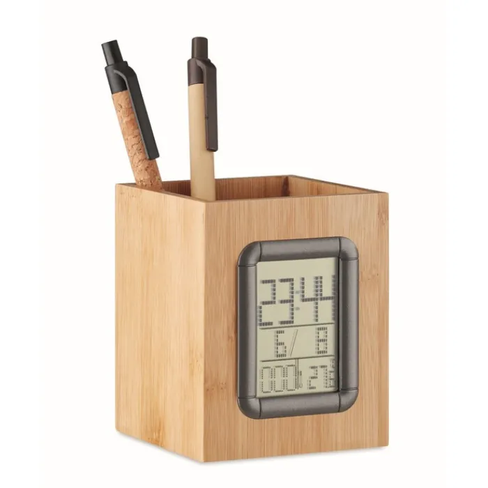 Portapenne in bambù con calendario, sveglia e termometro. 2 batterie bottone incluse. Il bambù è un prodotto naturale, potrebbero esserci leggere variazioni nel colore e nella dimensione di ogni articolo, che potrebbero influenzare il risultato di stampa finale. Questo articolo è consegnato in una scatola individuale.