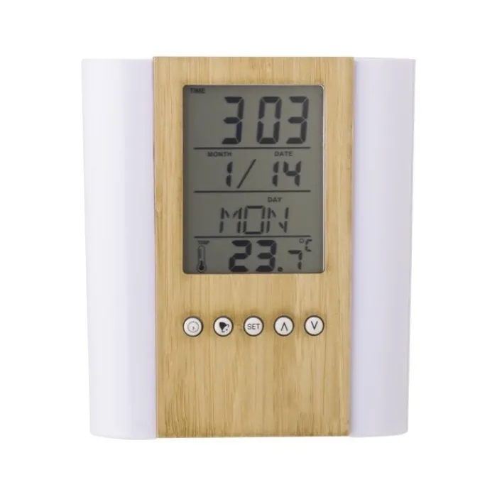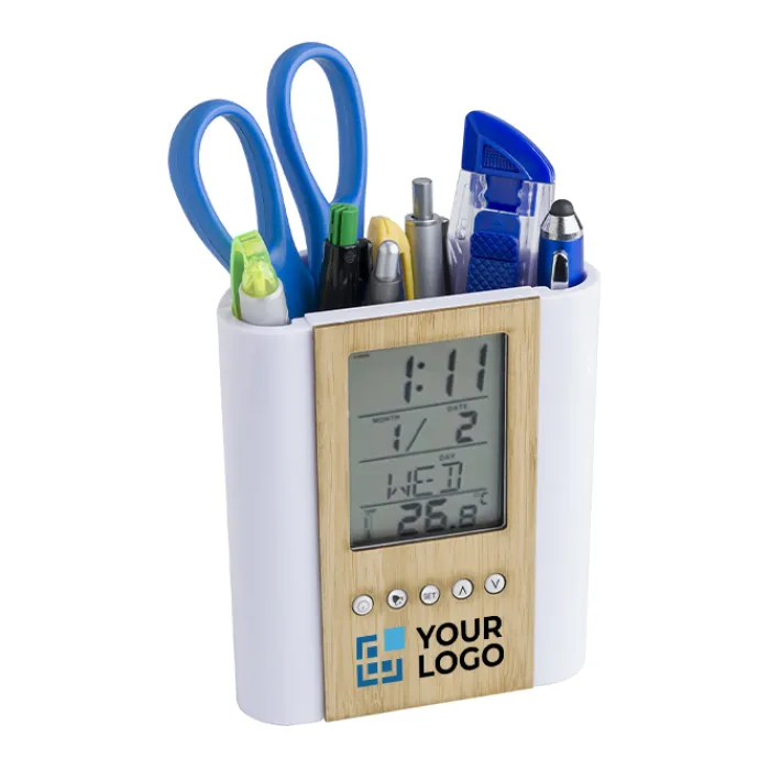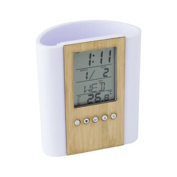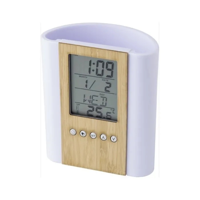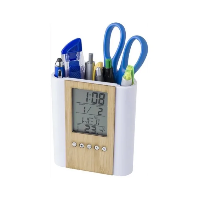 Portapenne da tavolo in bambù e plastica, che comprende un orologio multifunzione con diverse funzioni: indica l’ora, la temperatura e la data (giorno, data, mese), puoi impostare una sveglia, un timer e promemoria di compleanno. Funziona con una batteria Cell-CR2025 che viene inclusa.