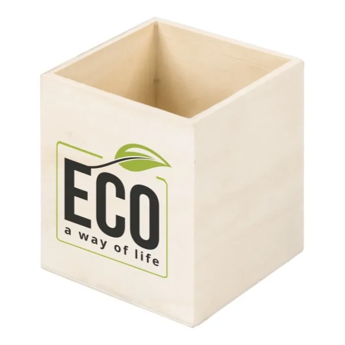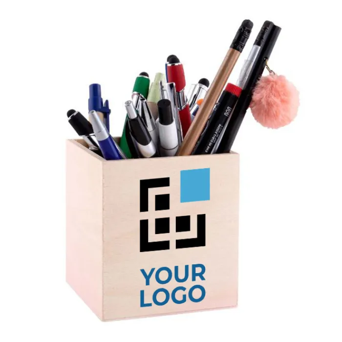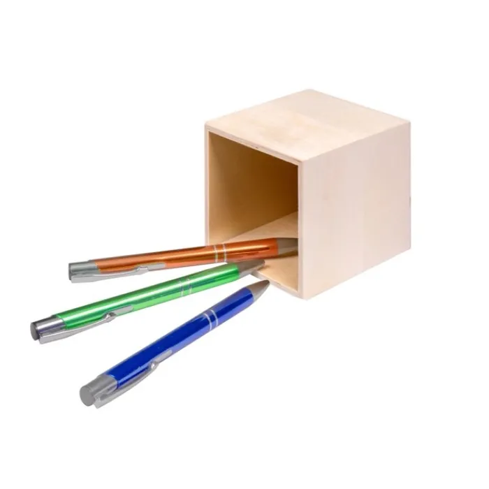 Cubo portapenne realizzato in pannello di legno, una scelta pratica e dal costo contenuto, perfetta come regalo da scrivania sempre utile e apprezzato. Ideale per tenere in ordine penne, matite e piccoli oggetti a portata di mano. La superficie in legno consente la personalizzazione con stampa a colori o incisione laser: in entrambi i casi, il tuo logo sarà il protagonista assoluto di questo articolo di merchandising. Inoltre, la sua finitura rende semplice la pulizia e ne valorizza l’aspetto nel tempo.