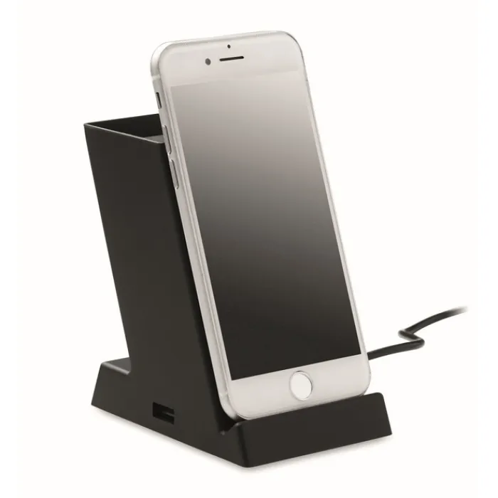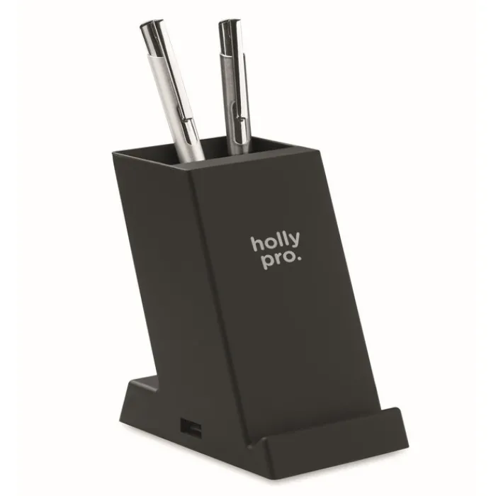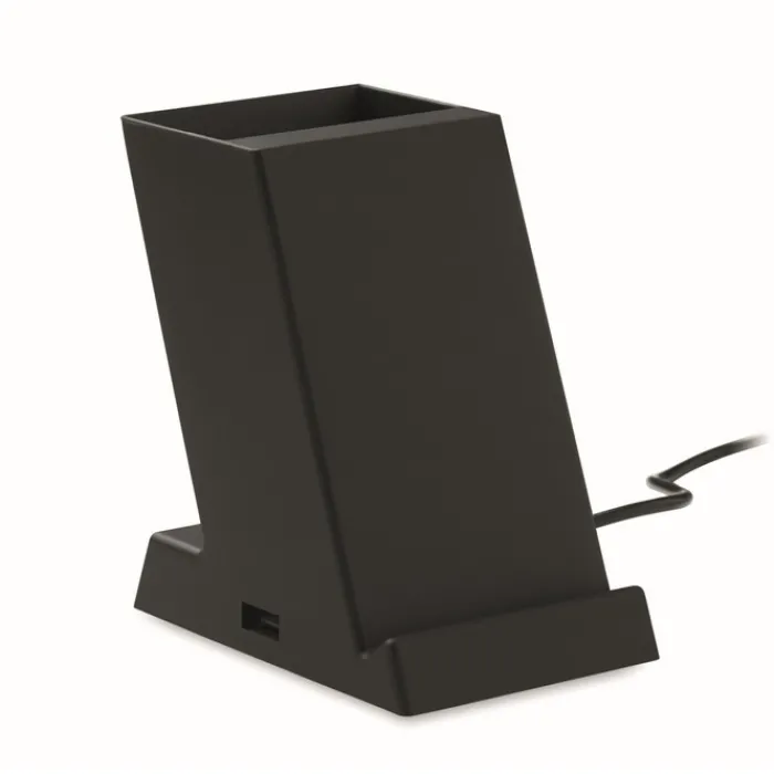 Porta penne in ABS, con supporto per cellulare e caricabatterie wireless dual coil da 15W. Uscita: DC 9 V/1,67 A, per una ricarica rapida. Uscita di alimentazione da 1 porta USB-A. Compatibile con gli ultimi Android, iPhone® 8, X e successivi. Basta posizionare il dispositivo mobile nel portapenne e inizierà a caricarsi.