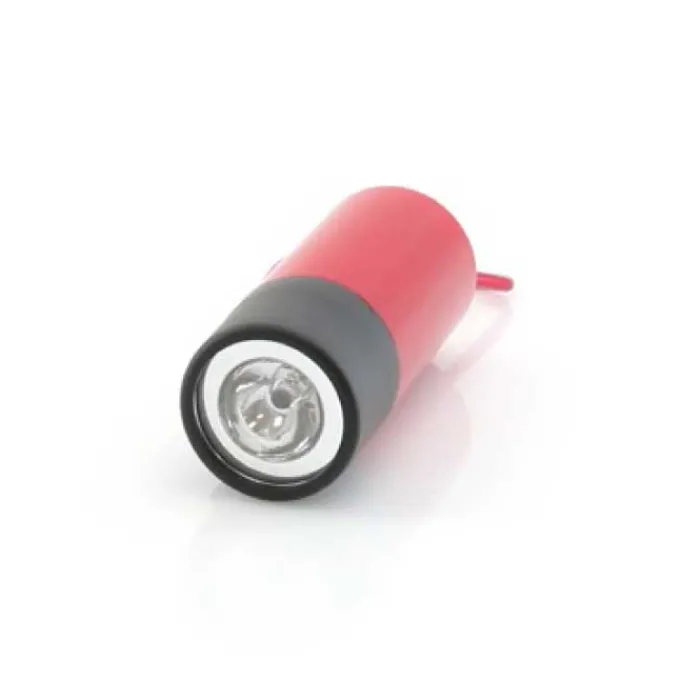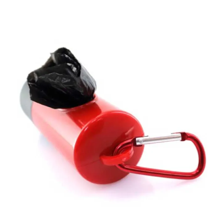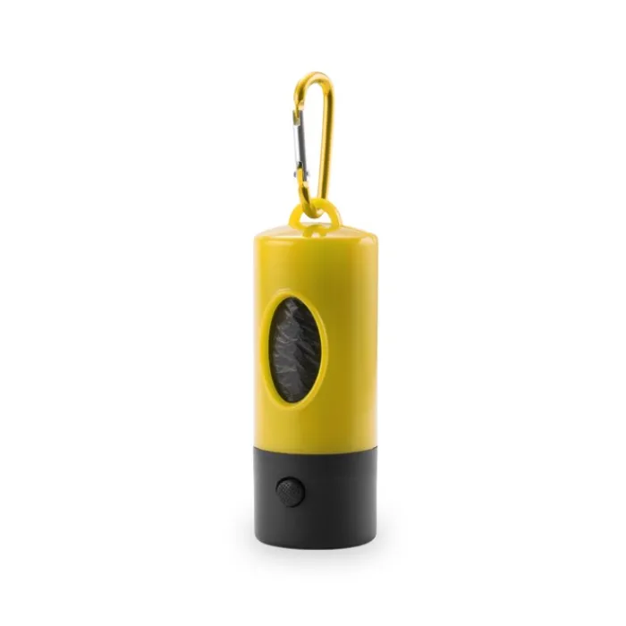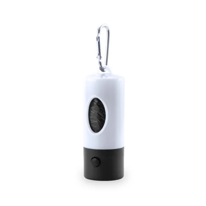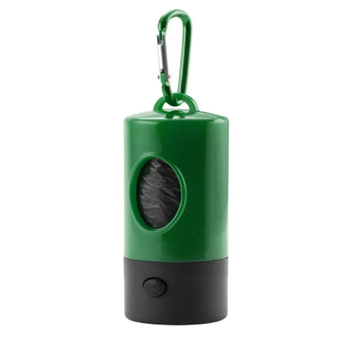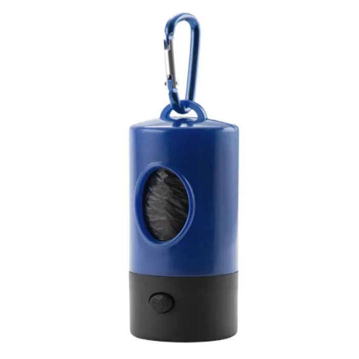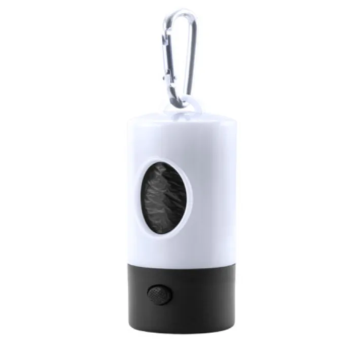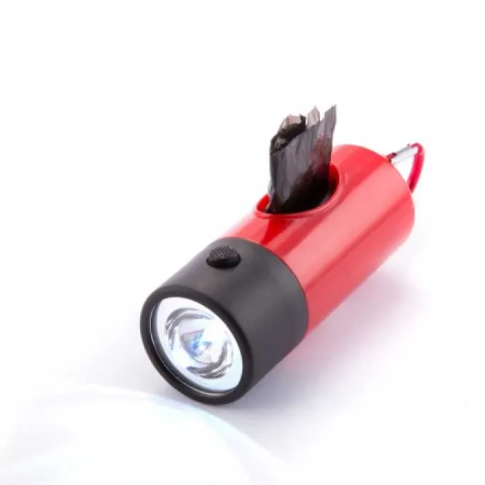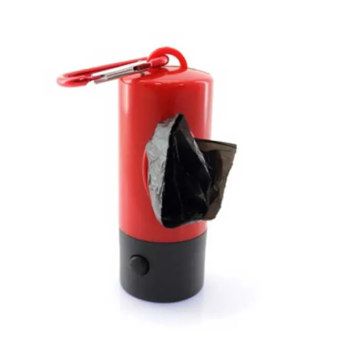 Dispenser di sacchetti igienici per animali con scocca resistente disponibile in vari colori vivaci. Include un moschettone abbinato e una torcia a LED sul lato opposto. Comprende 15 sacchettini. Batterie a bottone incluse.