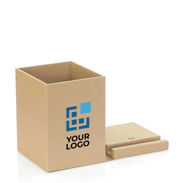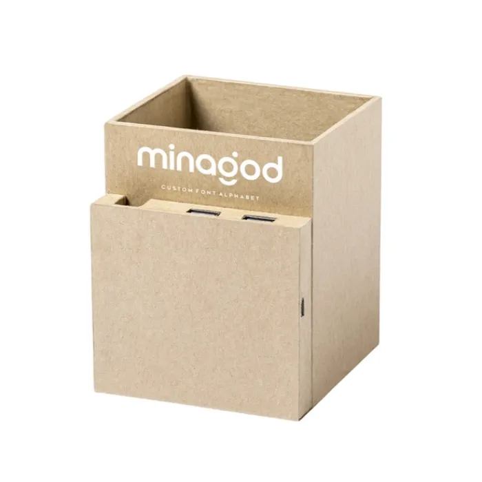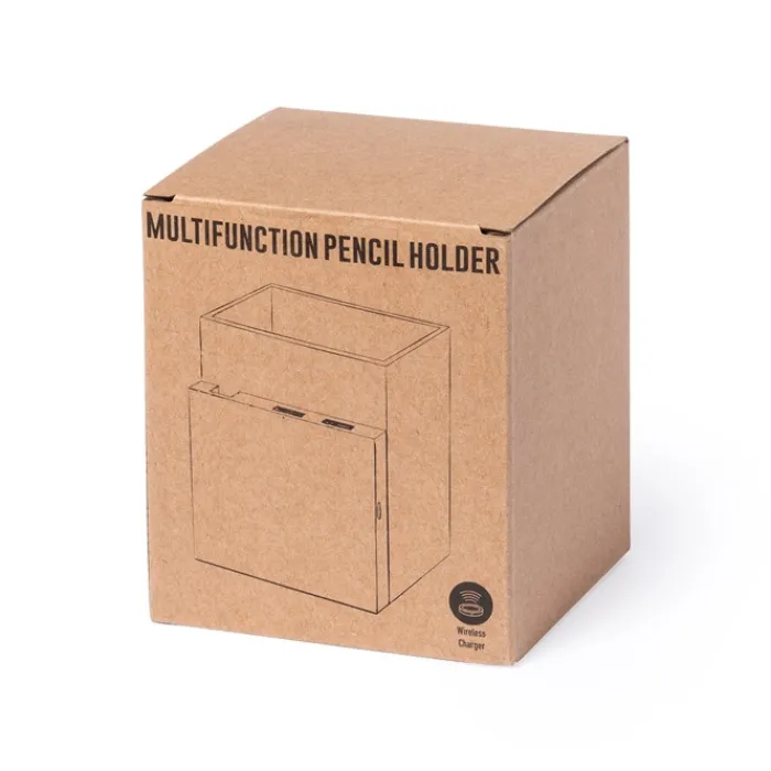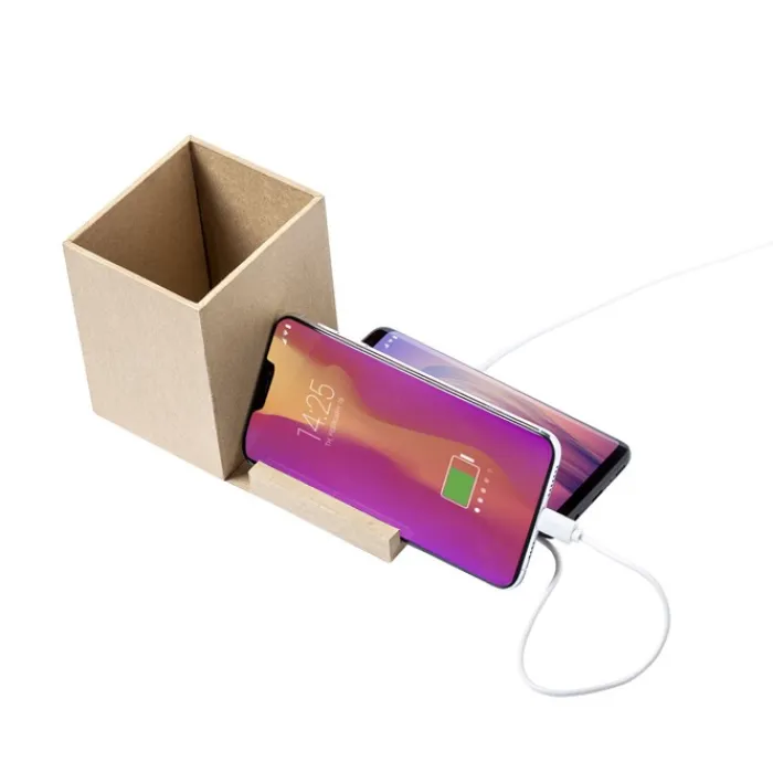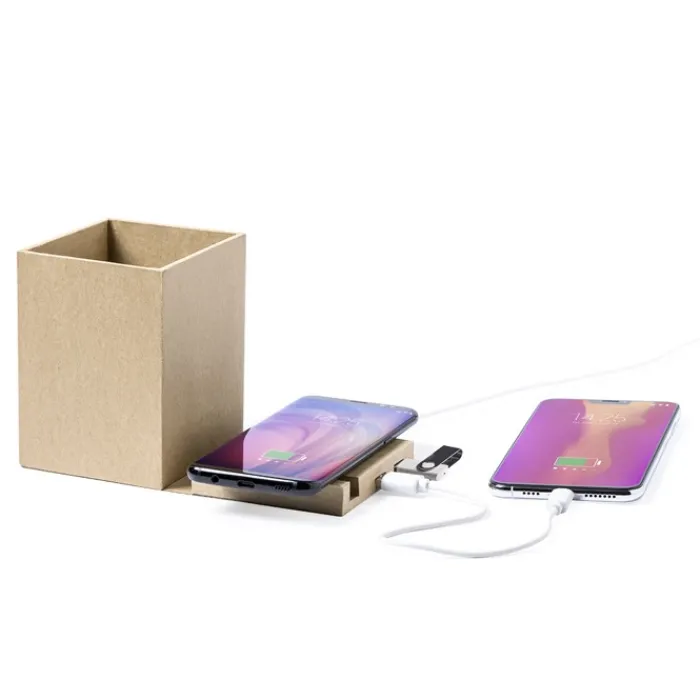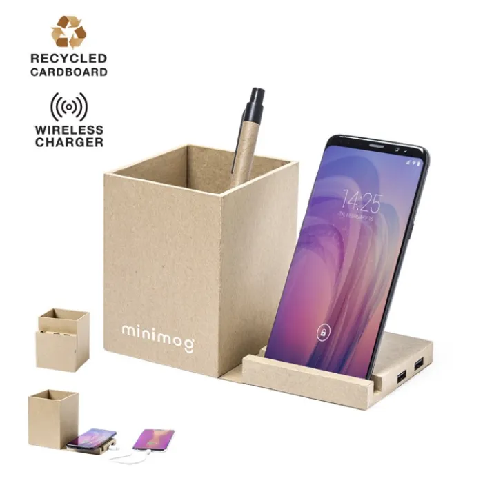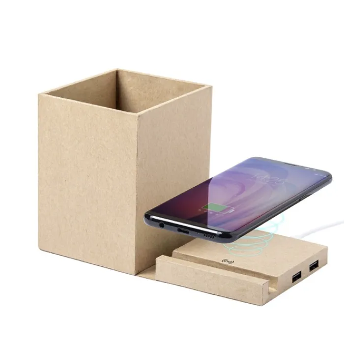 Portapenne multifunzione: ha uno spazio per appoggiare lo smartphone, una base di ricarica wireless e su un lato è dotato di 2 porte usb 2.0. Realizzato in cartone riciclato, ha un design pieghevole con regolazione magnetica. Compatibile con smartphone con tecnologia di ricarica wireless. Include un cavetto micro USB bianco lungo 1m. Confezionato singolarmente in un’attraente scatola di eco-design, con manuale di istruzioni in inglese e spagnolo.