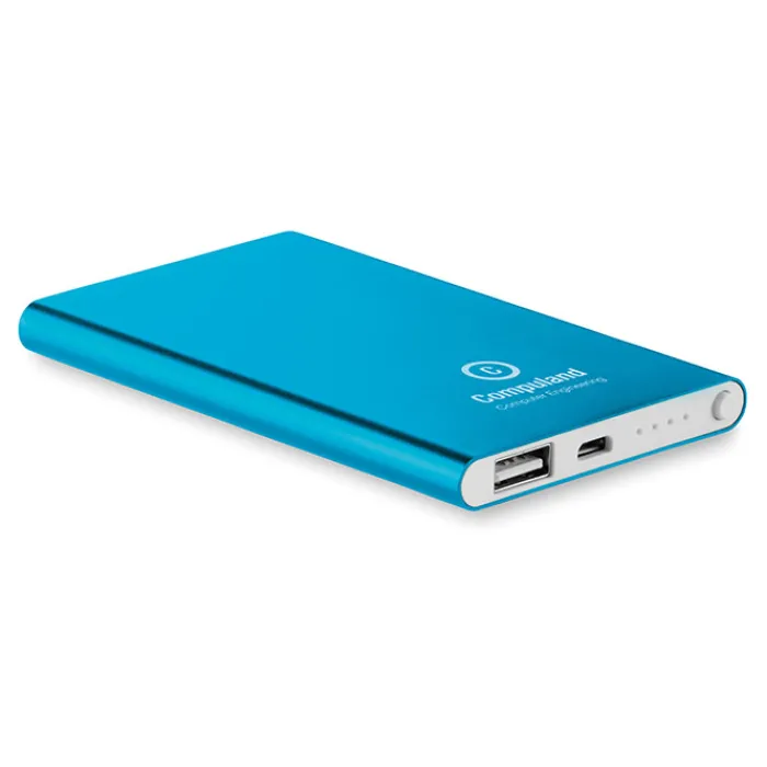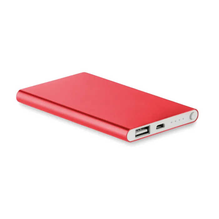 Sorprendi i tuoi clienti con questo pratico power bank da 4000 mAh, realizzato in alluminio di alta qualità e caratterizzato da un design piatto ed elegante. Questo bestseller non è solo un accessorio moderno, ma uno strumento indispensabile per mantenere sempre carico lo smartphone. Con una corrente di uscita DC 5V/1A e due porte di ingresso (Micro USB e USB), include un cavo micro USB, assicurandoti di essere sempre pronto a ogni evenienza. Inoltre, puoi personalizzarlo con il logo della tua azienda, trasformandolo in un regalo che rappresenta innovazione e sofisticazione.