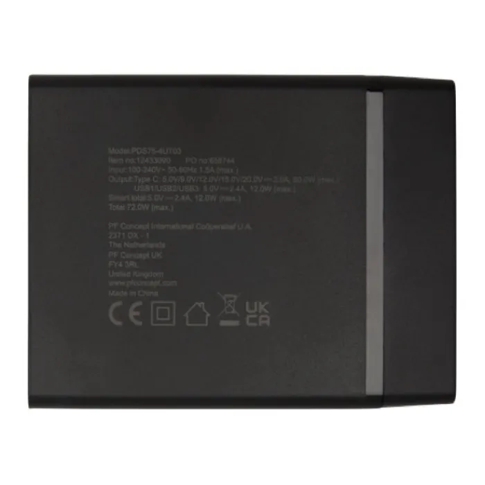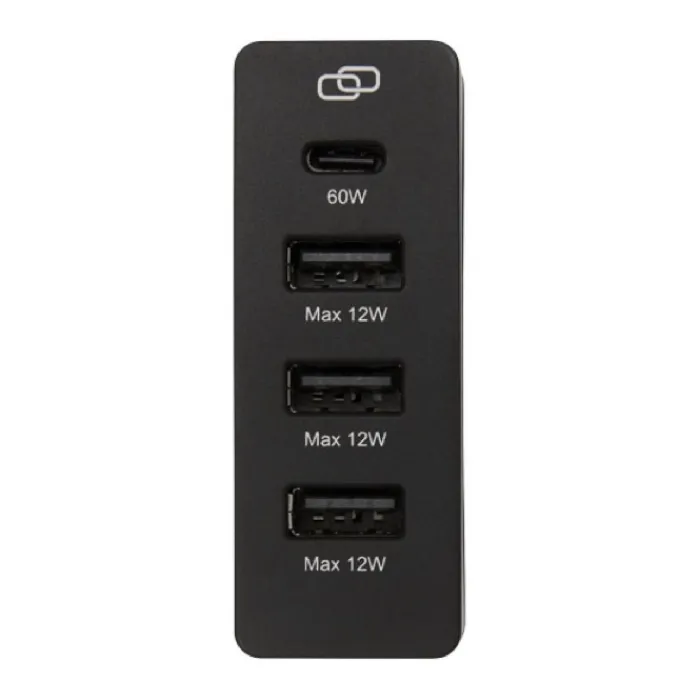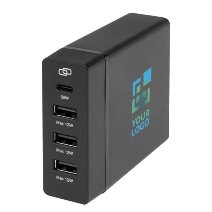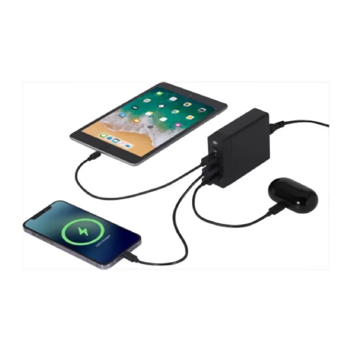 Stazione di ricarica progettata per ambienti internazionali, poiché include cavi compatibili con le prese dell’Unione Europea e del Regno Unito (100-240 V CA, 50/60 Hz). Dotata di tre porte USB-A e una porta USB-C, consente la ricarica simultanea di più dispositivi ad alta velocità. La porta USB-C offre tensioni di uscita variabili fino a 60 W, adattandosi a diverse esigenze di ricarica, mentre le porte USB-A forniscono un’uscita costante di 5 V/2,4 A ciascuna.