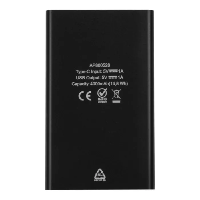 Power bank realizzato in alluminio riciclato da 4.000 mAh e 5W. Presenta un indicatore di carica, un pulsante di accensione, un ingresso di tipo C e uscita USB. Cavetto incluso. Ha le certificazioni per l’utilizzo di materiale riciclato e di conformità alle normative europee per i prodotti elettronici (RoHs). Presentati in una scatola di cartone.
