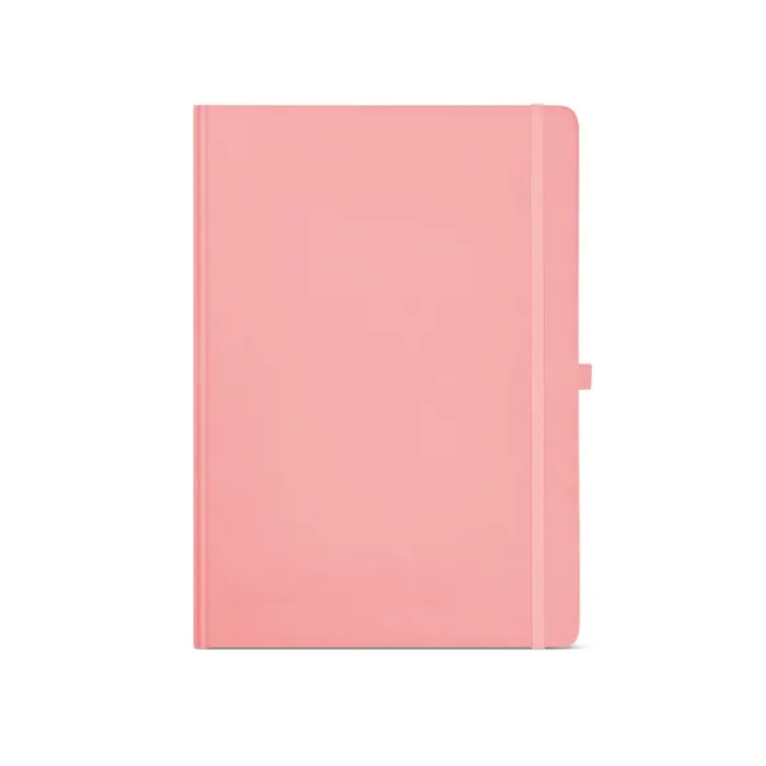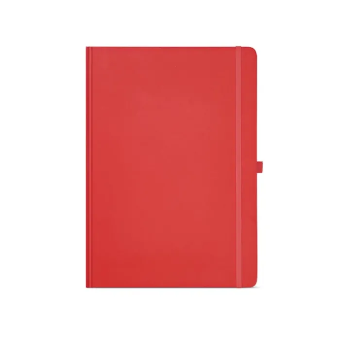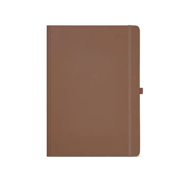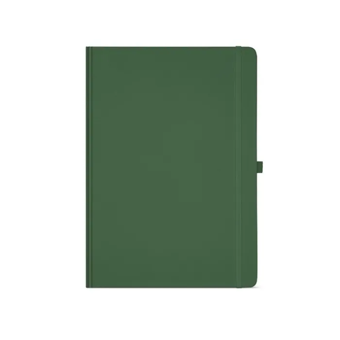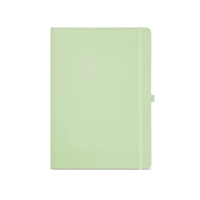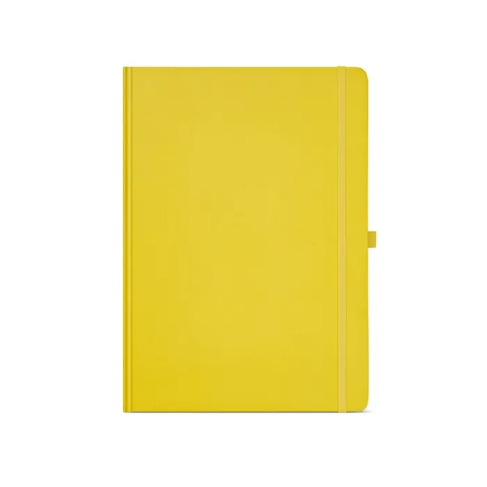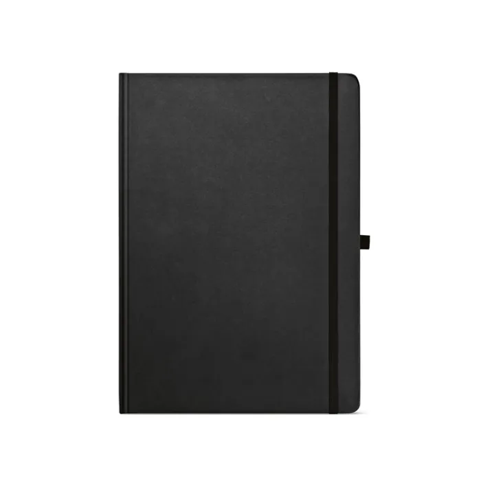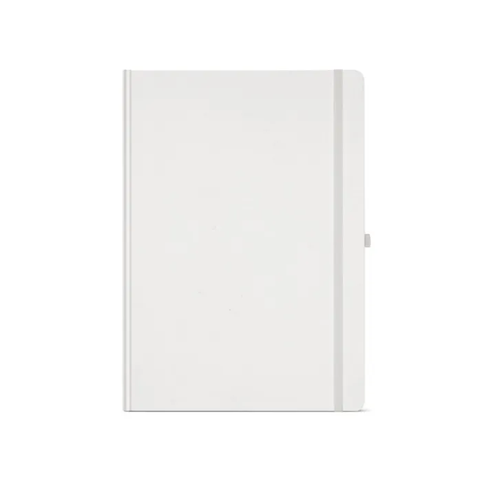 Taccuino formato A4 con copertina rigida eco-consapevole, realizzata con carta riciclata. Contiene 240 pagine a righe in color avorio di carta FSC da 70 g/m². Comprende un anello portapenne, una chiusura elastica es un nastrino segnapagina abbinato.