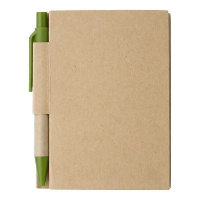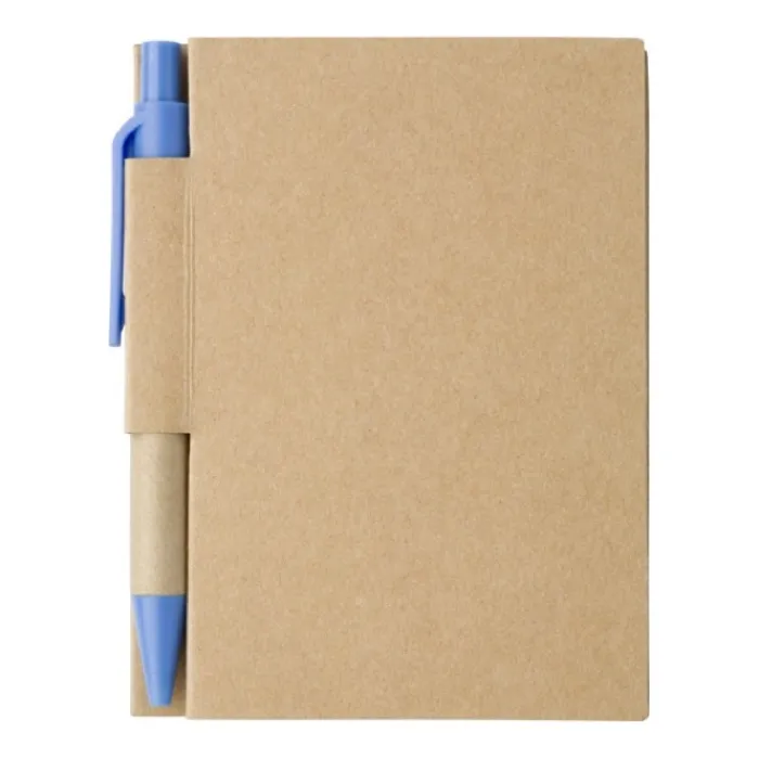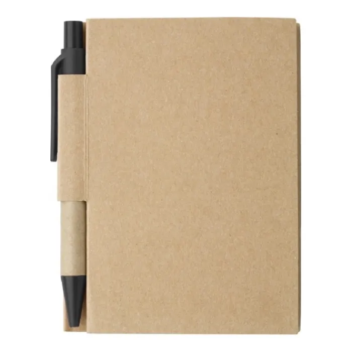 Taccuino in cartone con 80 pagine a righe e penna a sfera con corpo in cartone ed inchiostro nero.