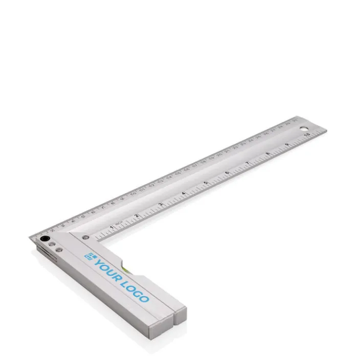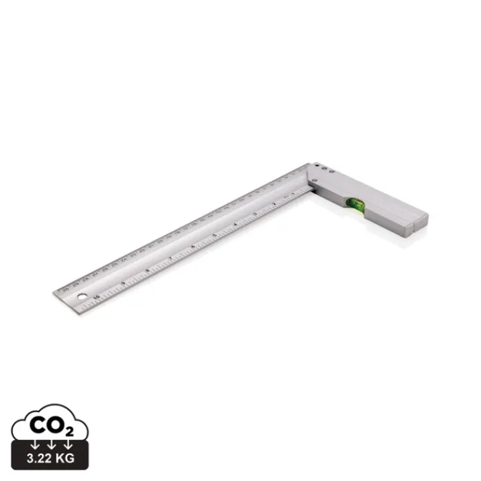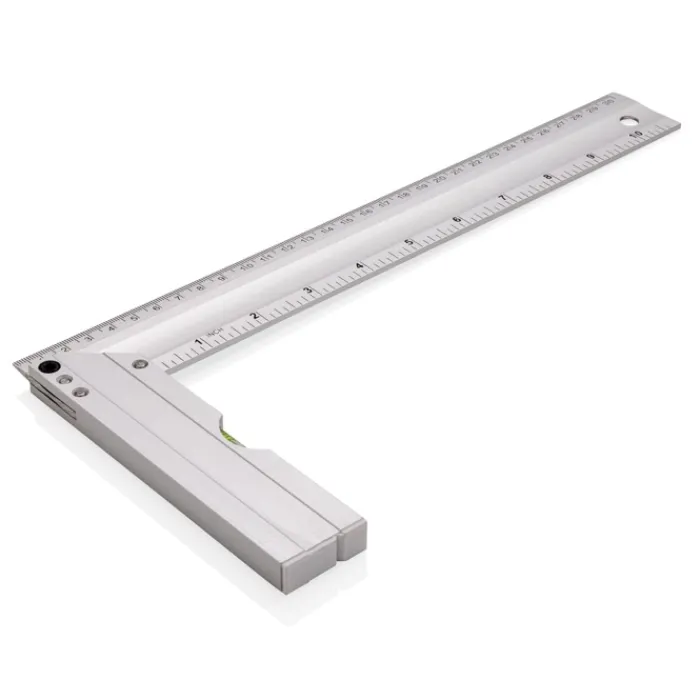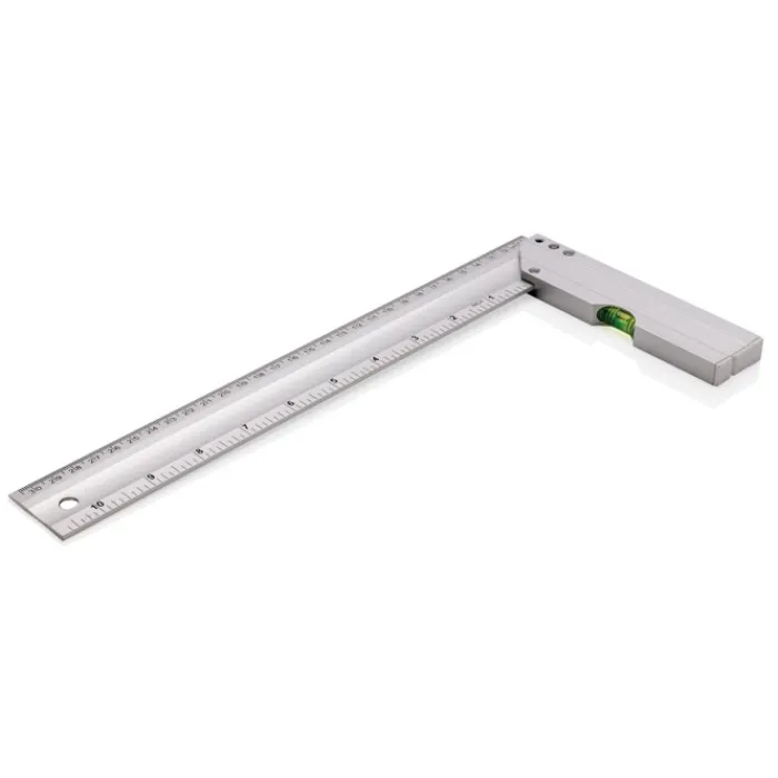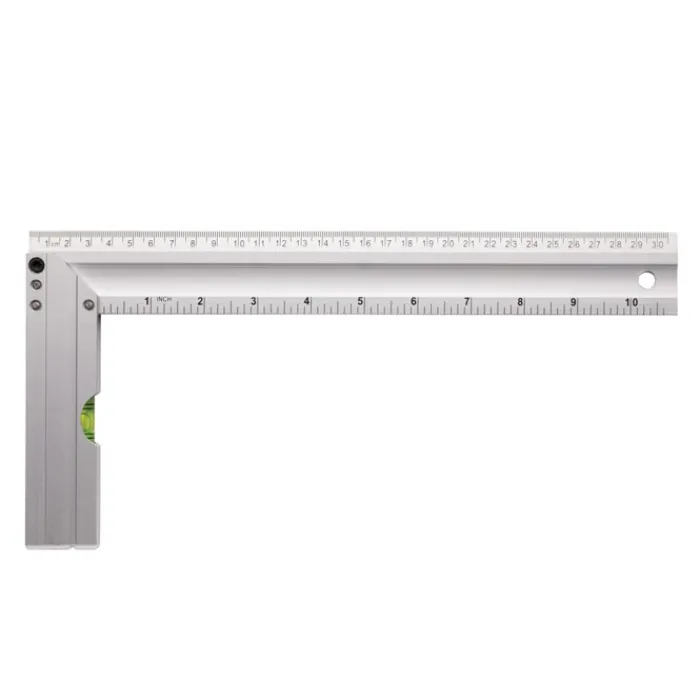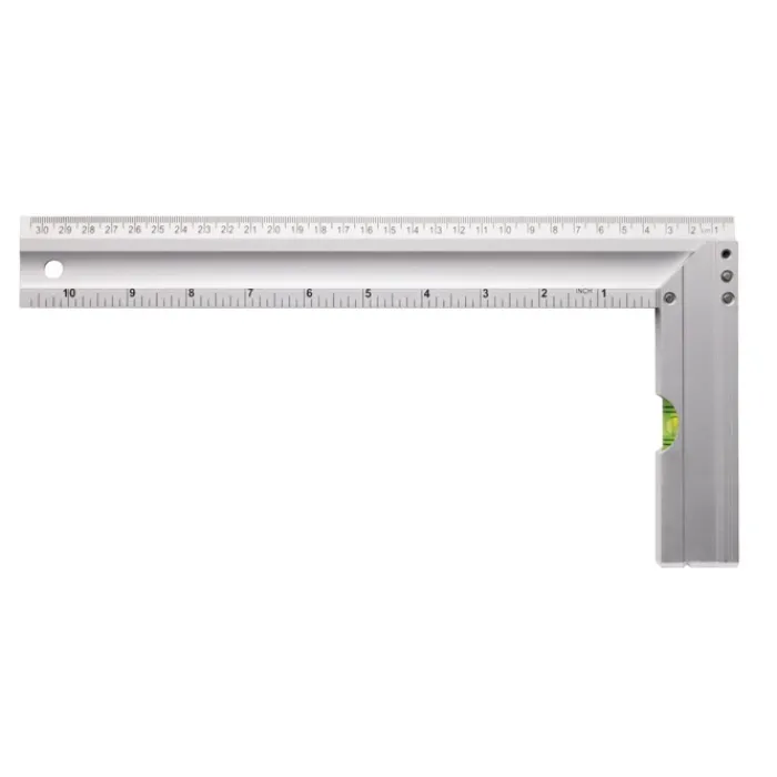 Righello professionale in alluminio con livella integrata, ottimo per misurare angoli e disegnare quadrati. Indicazione in cm (30) e pollici (10). Precisione della livella 0,5 mm.
