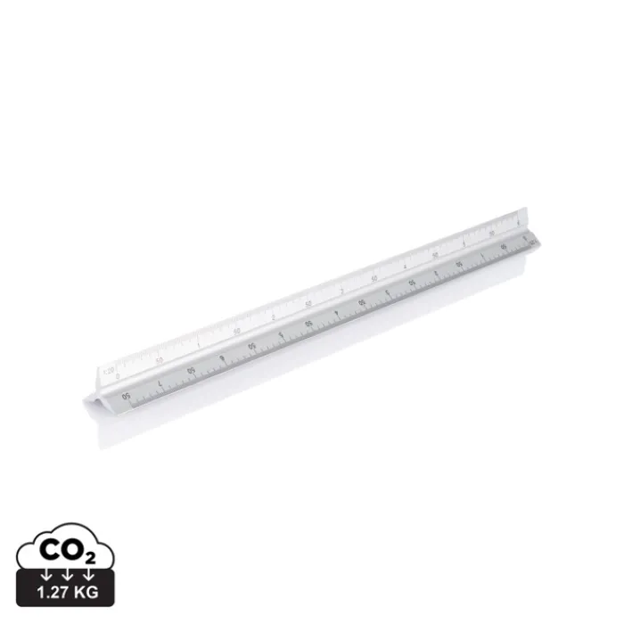 Scalimetro in alluminio lungo 30 cm con 5 diverse scale: 1:20, 1:25, 1:50, 1:75 e 1:100. Ha un lato libero per la personalizzazione.