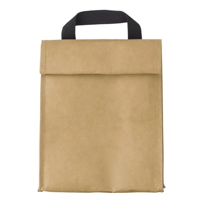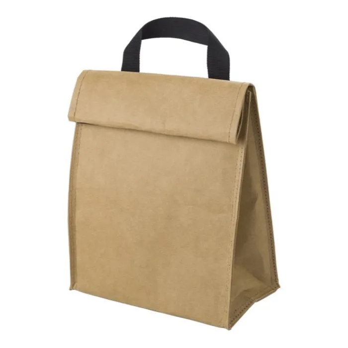Borsa termica in carta kraft lavabile con rivestimento interno in PEVA (15C). Ha un manico corto e la chiusura in velcro.