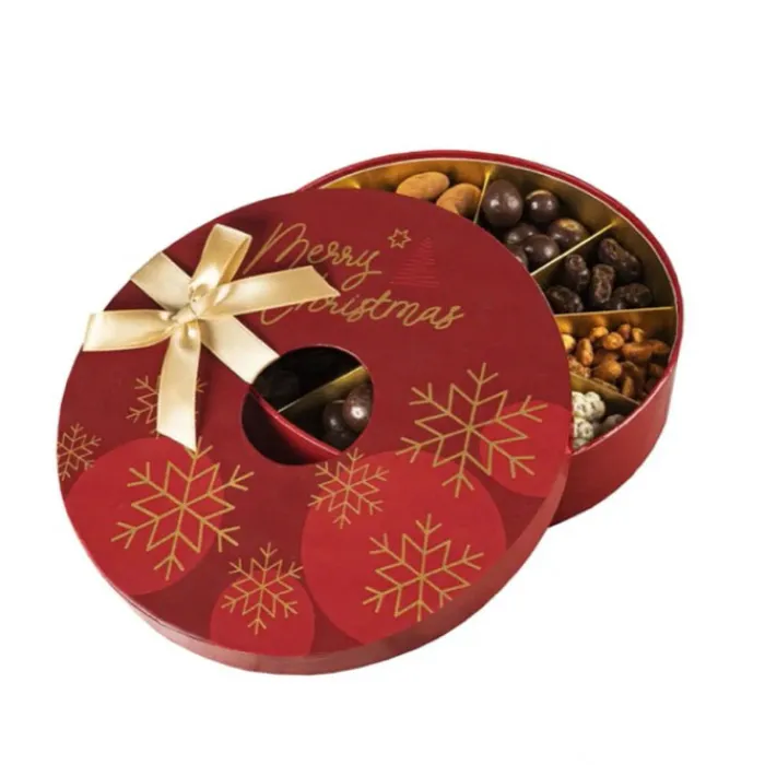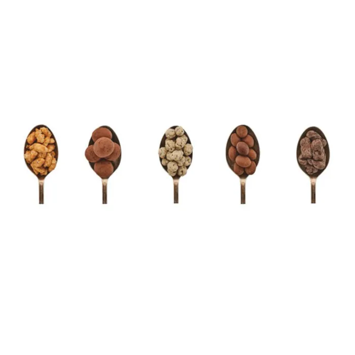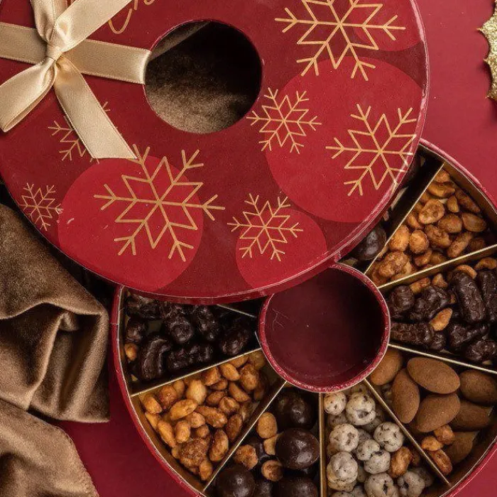 Scatola di delizie la cui forma ricorda una ghirlanda da 305g. Contiene 5 differenti dragée di cioccolato Callebaut® dal sapore intenso: arachidi caramellati con cannella, uva spina ricoperta di cioccolato fondente, ribes ricoperti di cioccolato bianco, mandorle al cioccolato al latte con cannella e scorza d’arancia ricoperta di cioccolato fondente. Data di scadenza: 6 mesi.