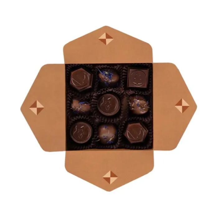 Assortimento di 9 cioccolatini artigianali da 107g. Ognuno è una combinazione raffinata, ci sono: praline di cioccolato al latte, con 33% di cacao e ripieno di caffè Pluton decorati con un sigillo di cioccolato fondente fatto con il 57% di cacao, che presenta simboli festivi, e prugne ricoperte di cioccolato al latte con il 33% di cacao e decorate con petali di fiordaliso. Sono realizzati con cioccolato belga certificato Cocoa Horizons, mentre il caffè Pluto, che dona il sapore del ripieno, è tostato artigianalmente. Presentate in una confezione biodegradabile al 100%. Data di scadenza: 4 mesi.