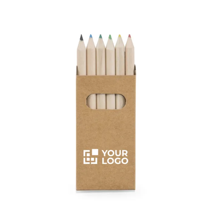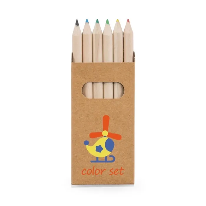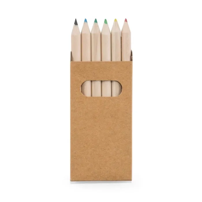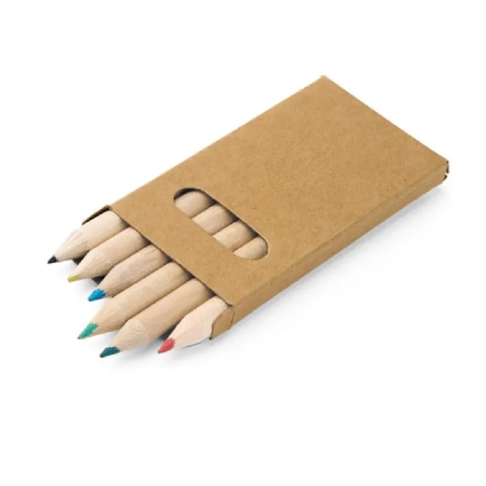 Scatola di cartone con 6 matite colorate: nero, azzurro, verde scuro e chiaro, rosso e giallo.